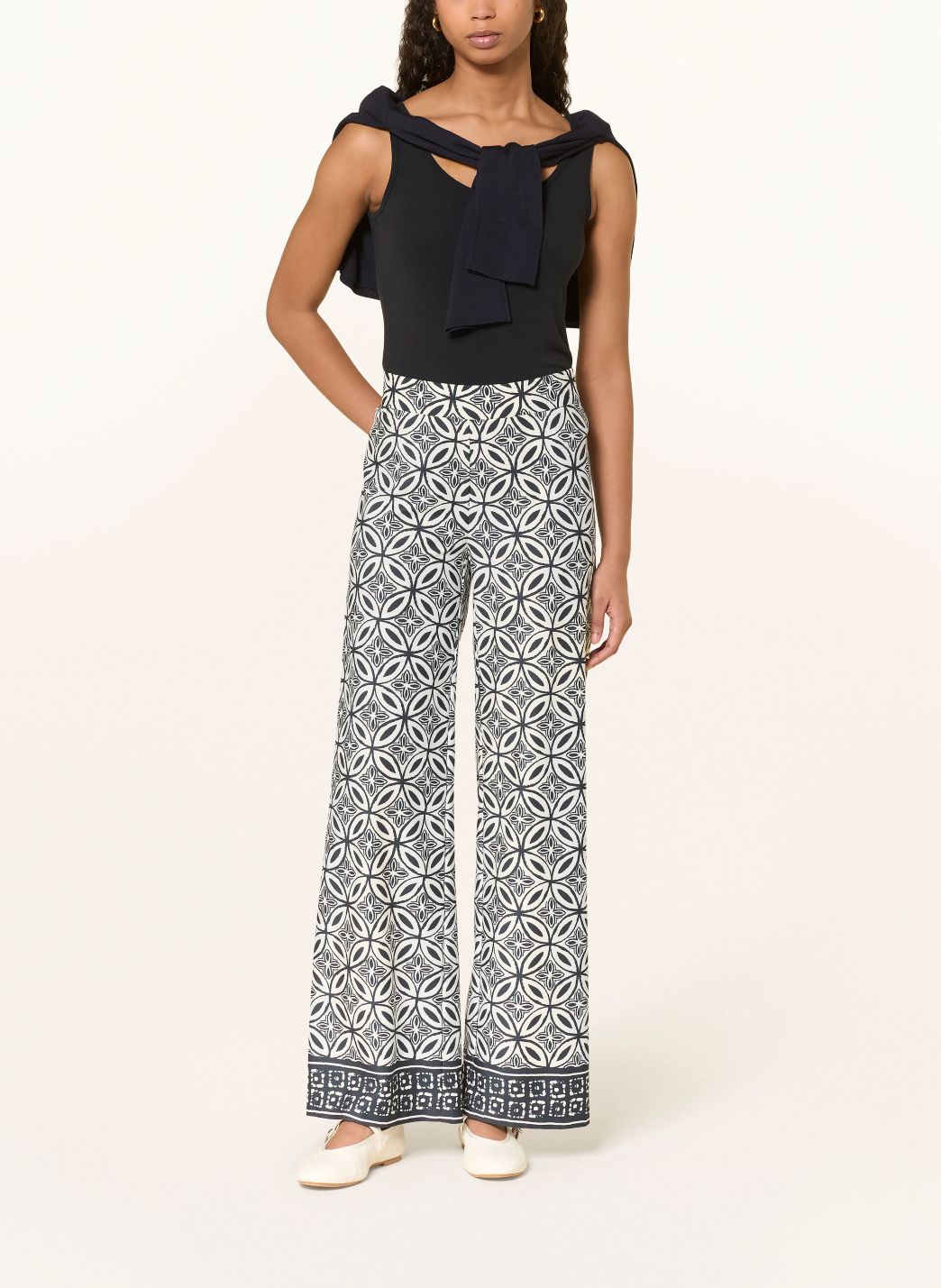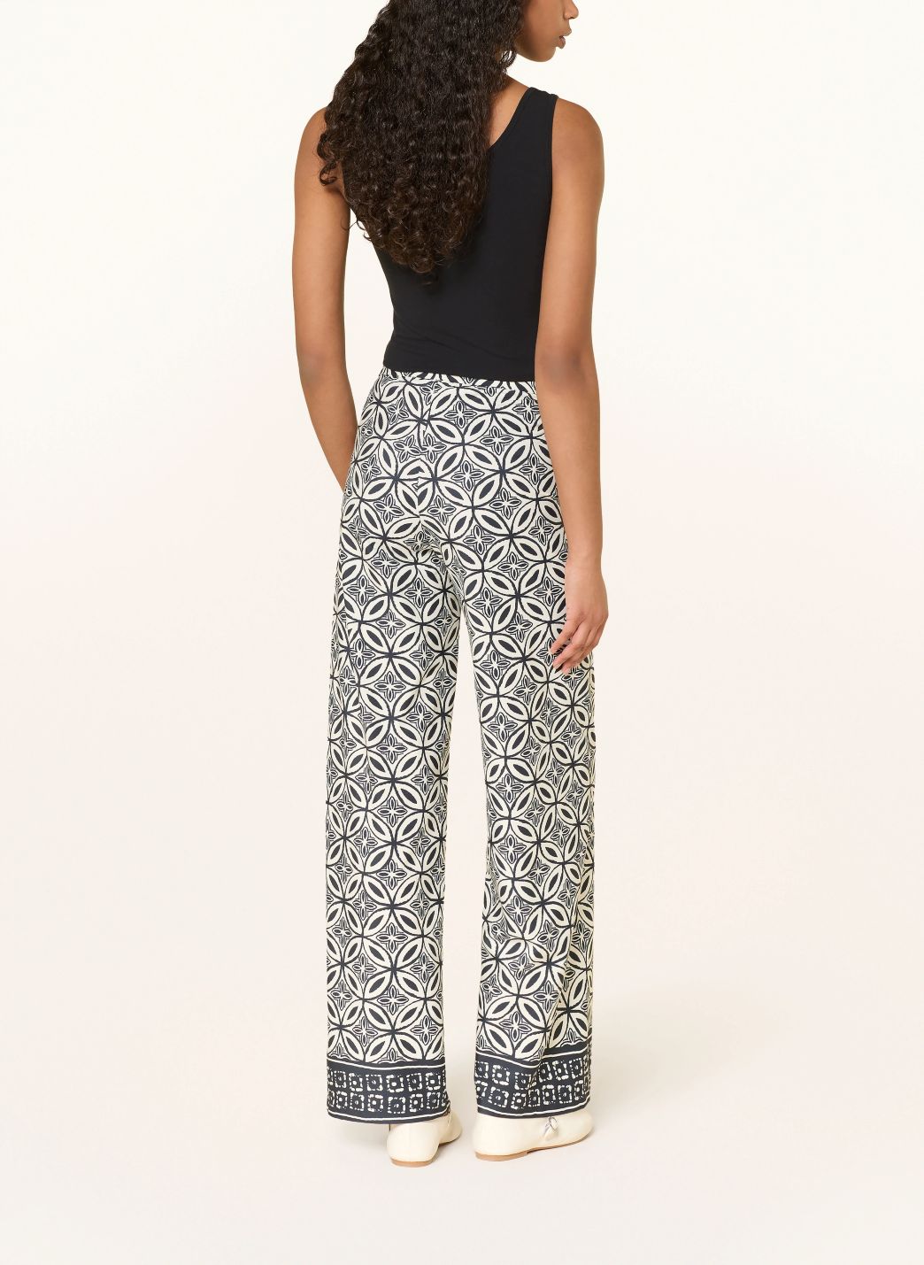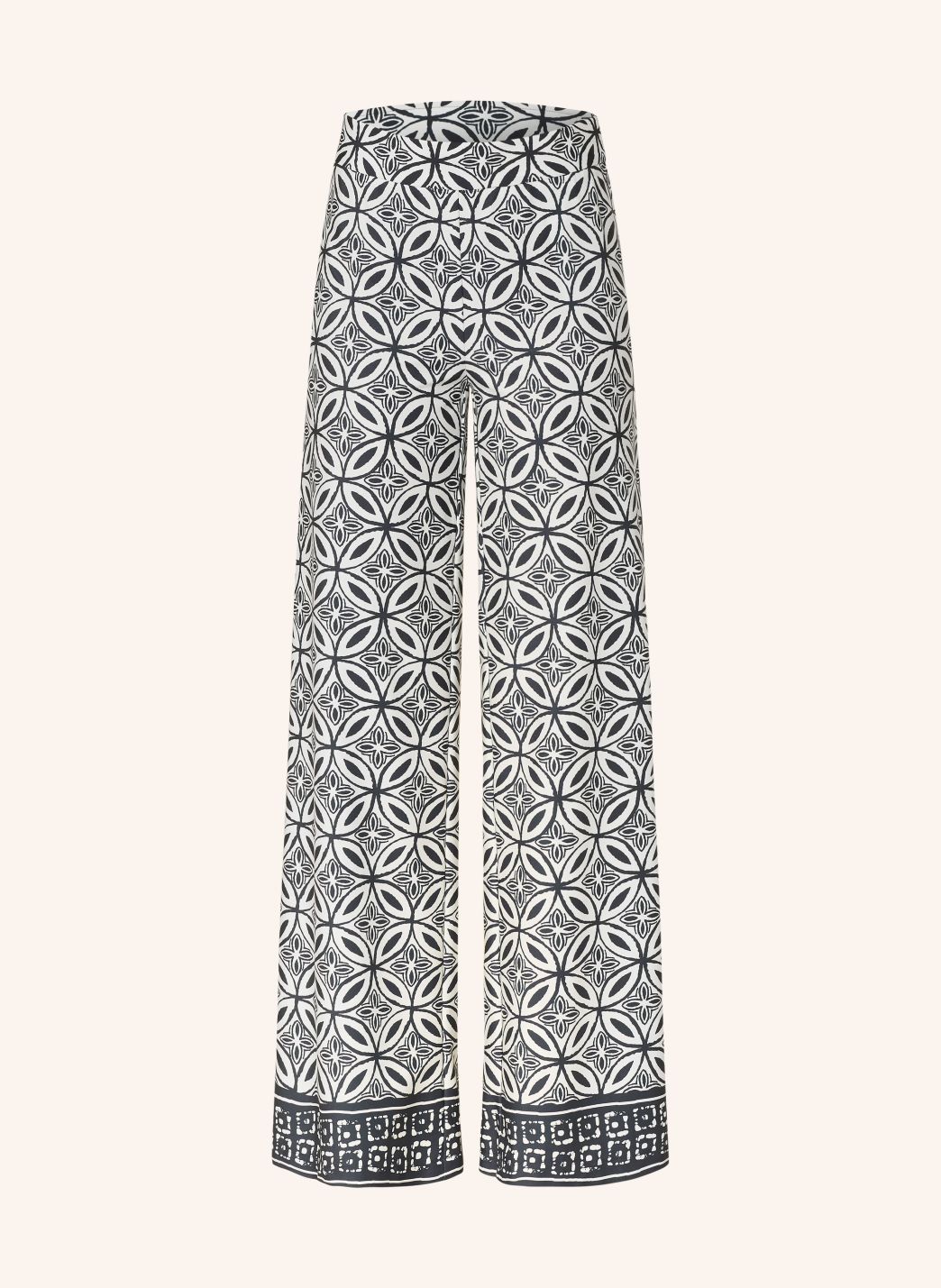 Superbehagelig bukse med vide ben og strikk i livet. Den har et geometrisk heldekkende mønster av sammenflettede sirkler og blomsterornamenter, som går over i en kontrasterende etnisk-stil kant nederst.