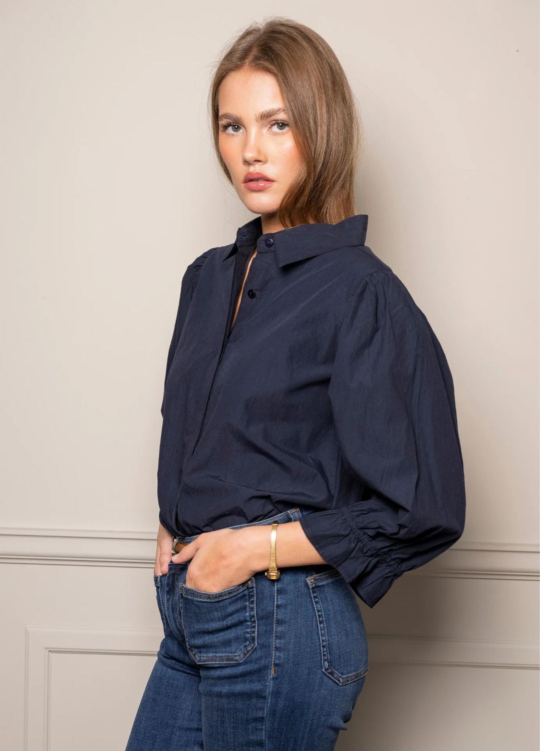 Amy-skjorten har en behagelig bomullspoplinkvalitet og vakre feminine detaljer. Rysjer og strikk langs mansjettene, sammen med stilige puffermer, gjør den til et ypperlig valg å putte i et skjørt eller jeans. En komfortabel, normal passform.