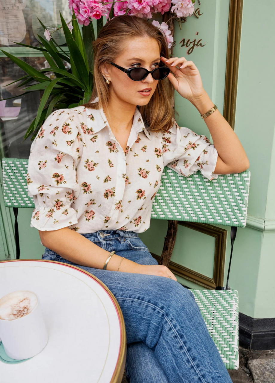 Amy-skjorten har behagelig bomull/lin-kvalitet og vakre blomsterdetaljer. Volanger og strikk langs mansjettene, sammen med stilige puffermer, gjør Amy til det perfekte valget for å forsterke hverdagslooken!