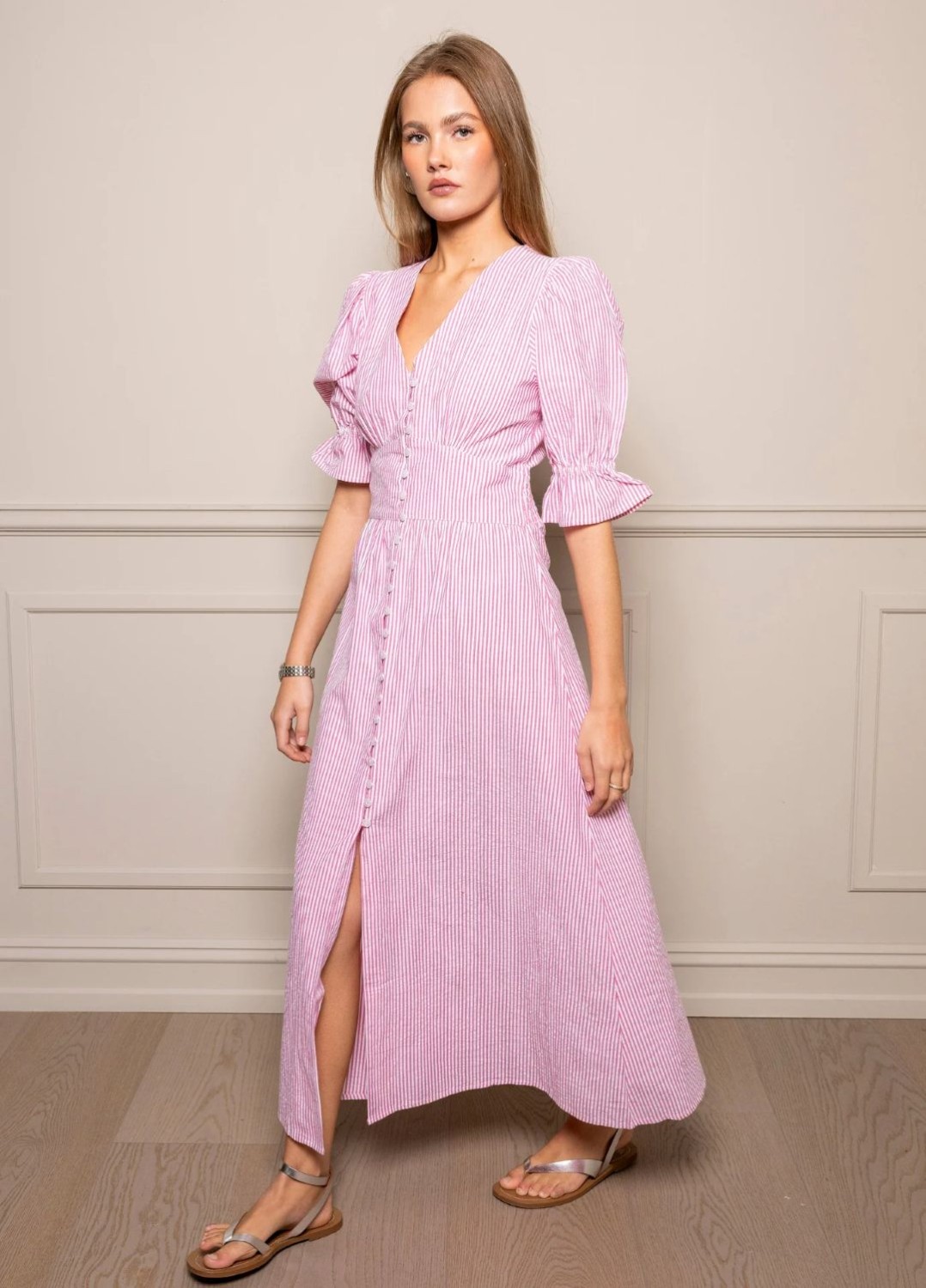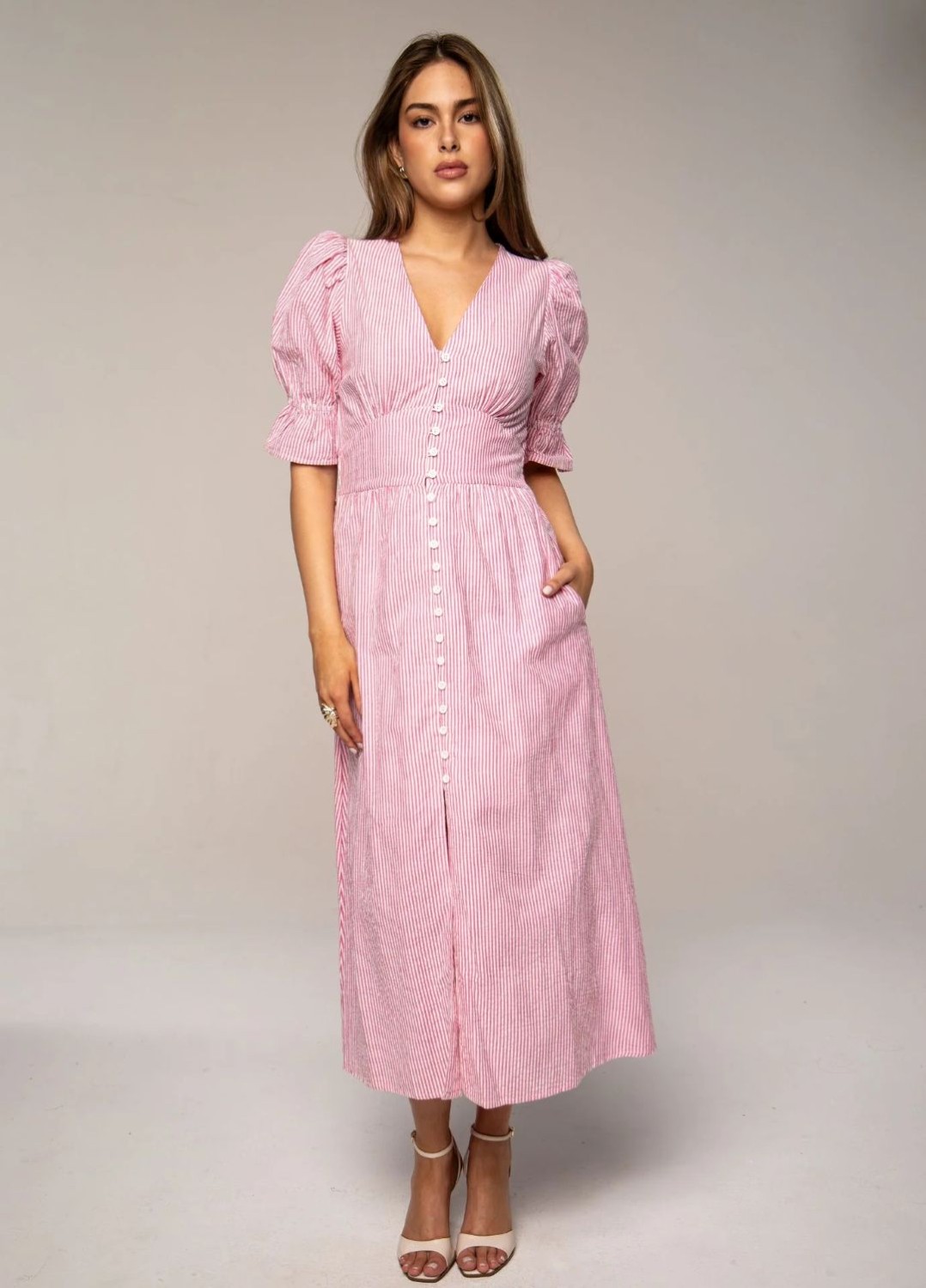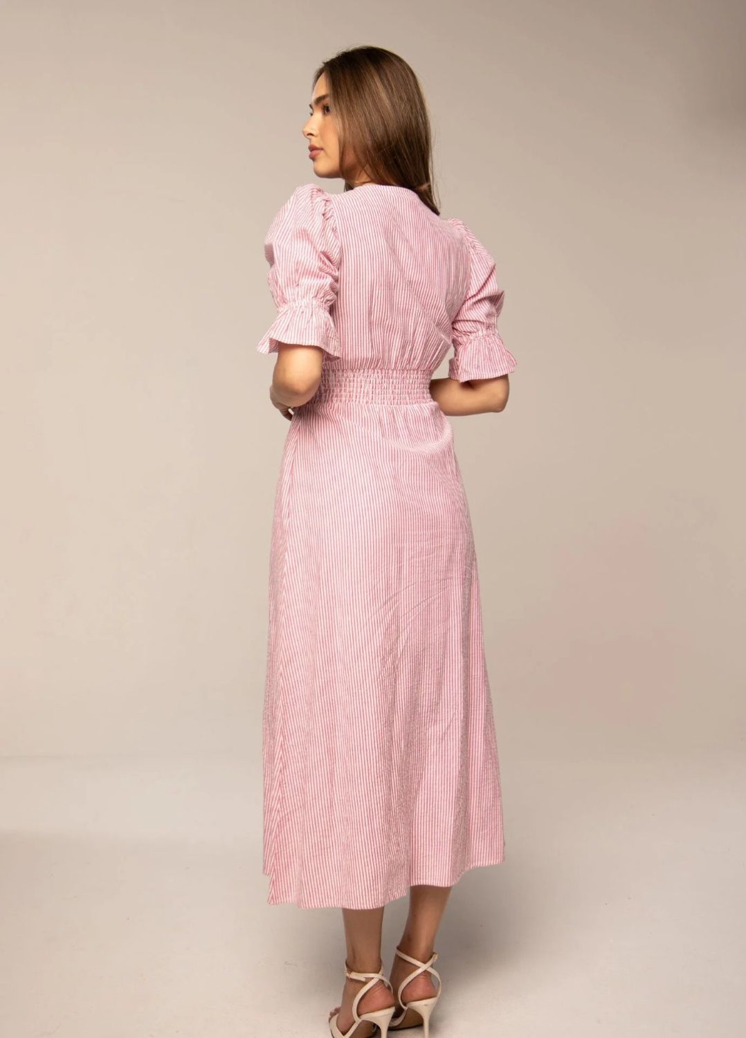 Denne lekre kjolen har en midilengde, tettsittende midje og store, voluminøse ermer. Knapper foran. En komfortabel passform som er normal i størrelsen. Velg din vanlige størrelse. Innerfôr i skjørtet.