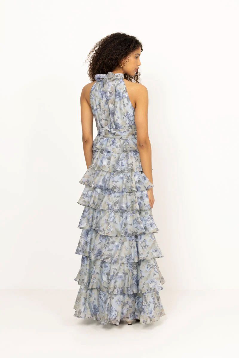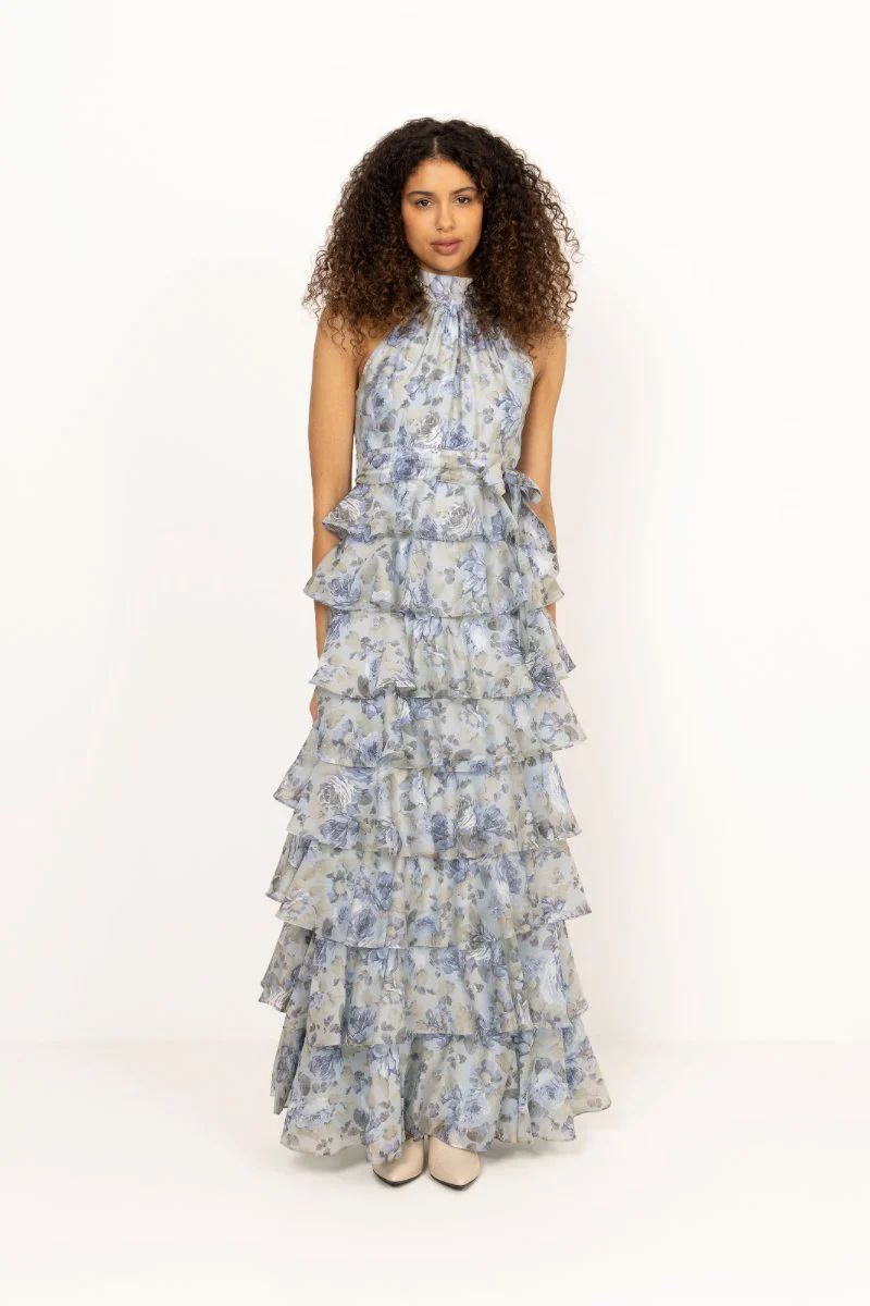 Nydelig maxikjole i et nydelig blomsterprint. Den har en elegant halterneck som knytes i nakken. Den markerte midjen fremhever silhuetten, før skjørtet faller vakkert og luftig. Det lange, voluminøse skjørtet har delikate kappe-detaljer som gir et romantisk preg. Det lette stoffet gir et nydelig fall og bevegelse, noe som gjør kjolen perfekt for sommerens fineste anledninger som bryllup og hagefester.