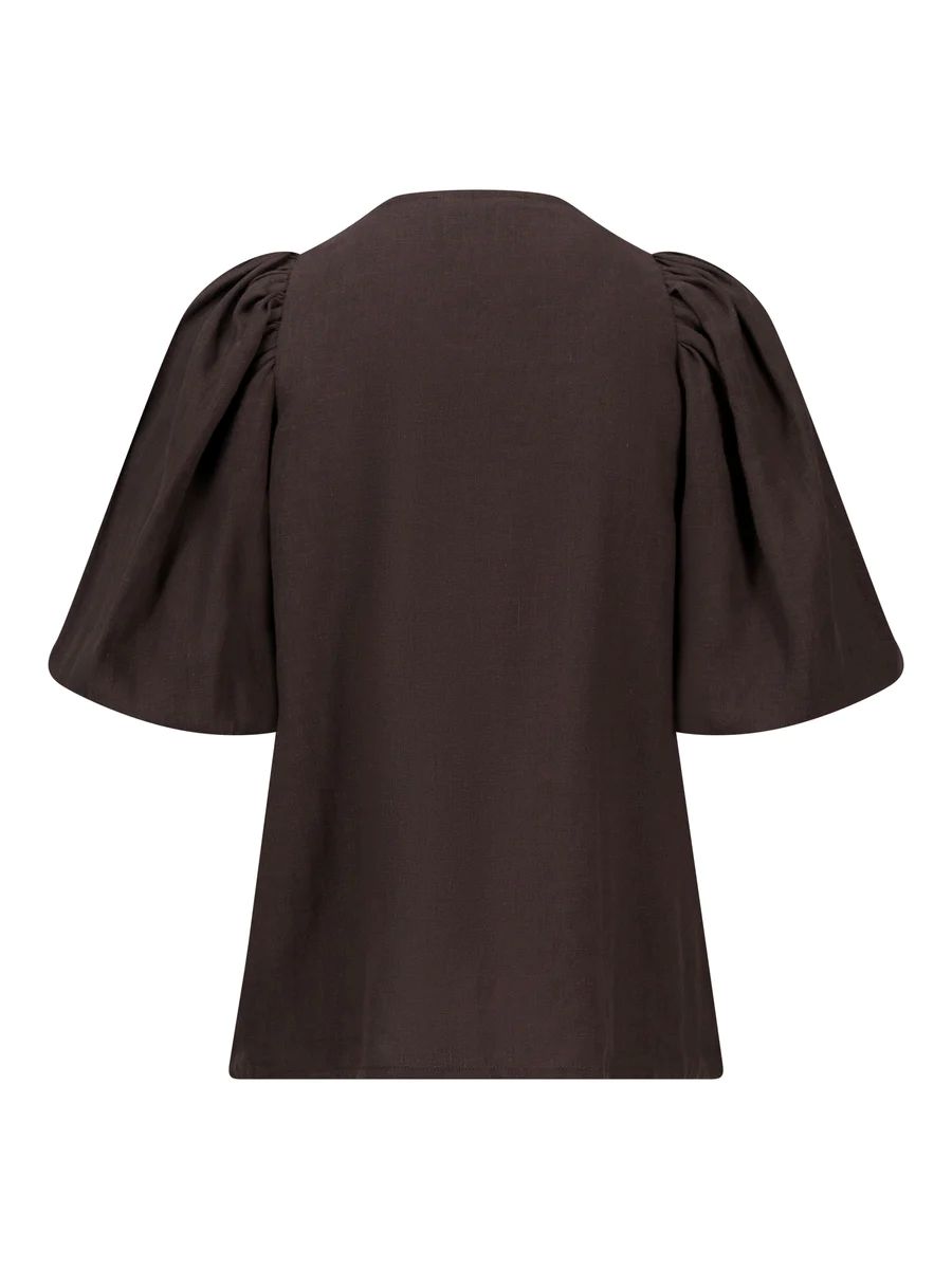 ekker topp, i deilig sval lin. Den har korte ermer med volum og puff på skuldrene, rund hals med knapp i front og en rett passform.