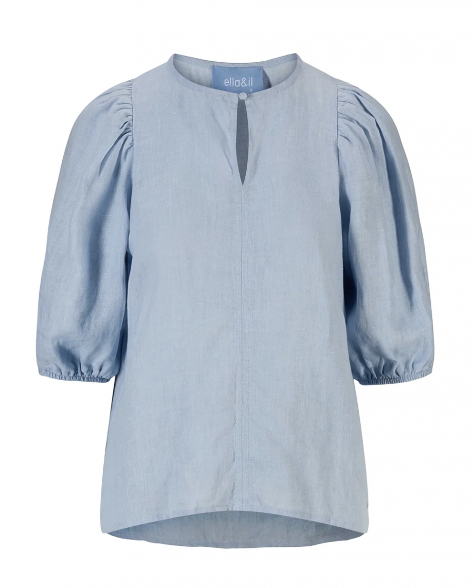 Lekker topp, i deilig sval lin. Den har korte ermer med volum og puff på skuldrene, rund hals med knapp i front og en rett passform.