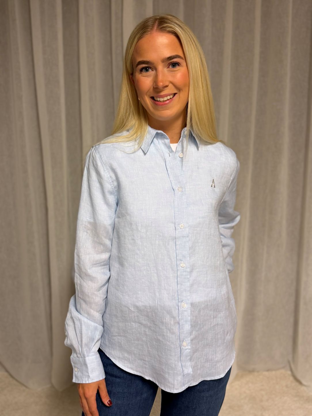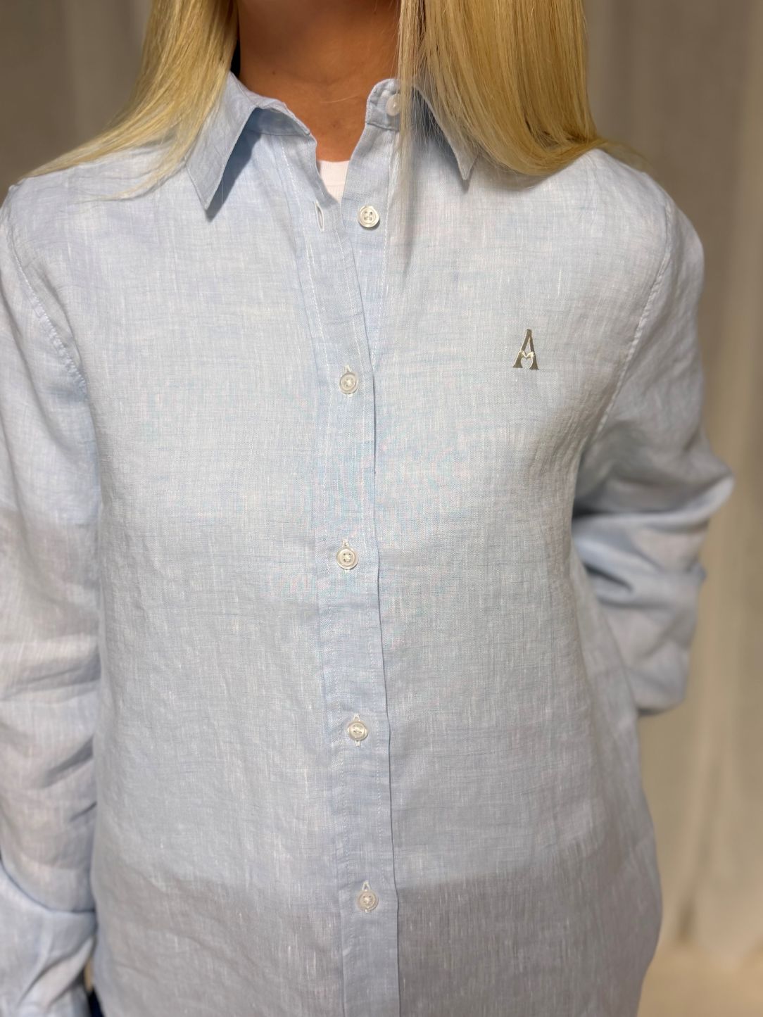 Klassisk langermet skjorte i luftig lin. Modellen er designet med spiss krage, boksfold bak og lave mansjetter. Har en rett fasong med buede kanter, og er noe lengre bak enn foran.