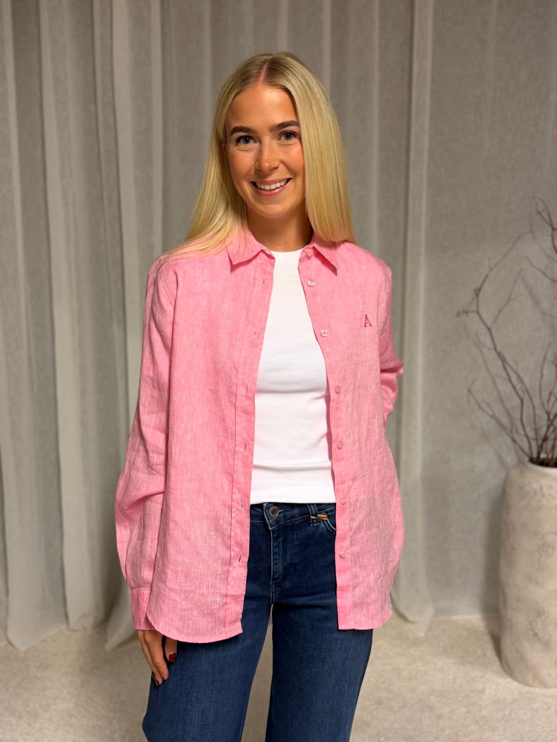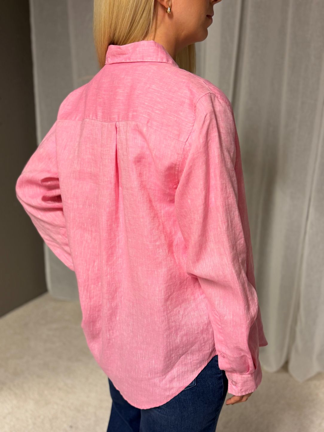 Klassisk langermet skjorte i luftig lin. Modellen er designet med spiss krage, boksfold bak og lave mansjetter. Har en rett fasong med buede kanter, og er noe lengre bak enn foran.