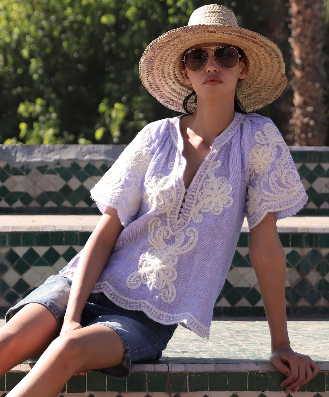 Azalea raglanermet kombinerer vintage-inspirert sjarm med moderne letthet. Laget av fint blått og hvitt stripete lin, har det en iøynefallende halsutringning og ermer rikt dekorert med intrikate båndarbeider. Håndferdige kamskjellkanter følger raglanermene og falden. En særegen, feminin stil som løfter både skreddersydde og avslappede antrekk.