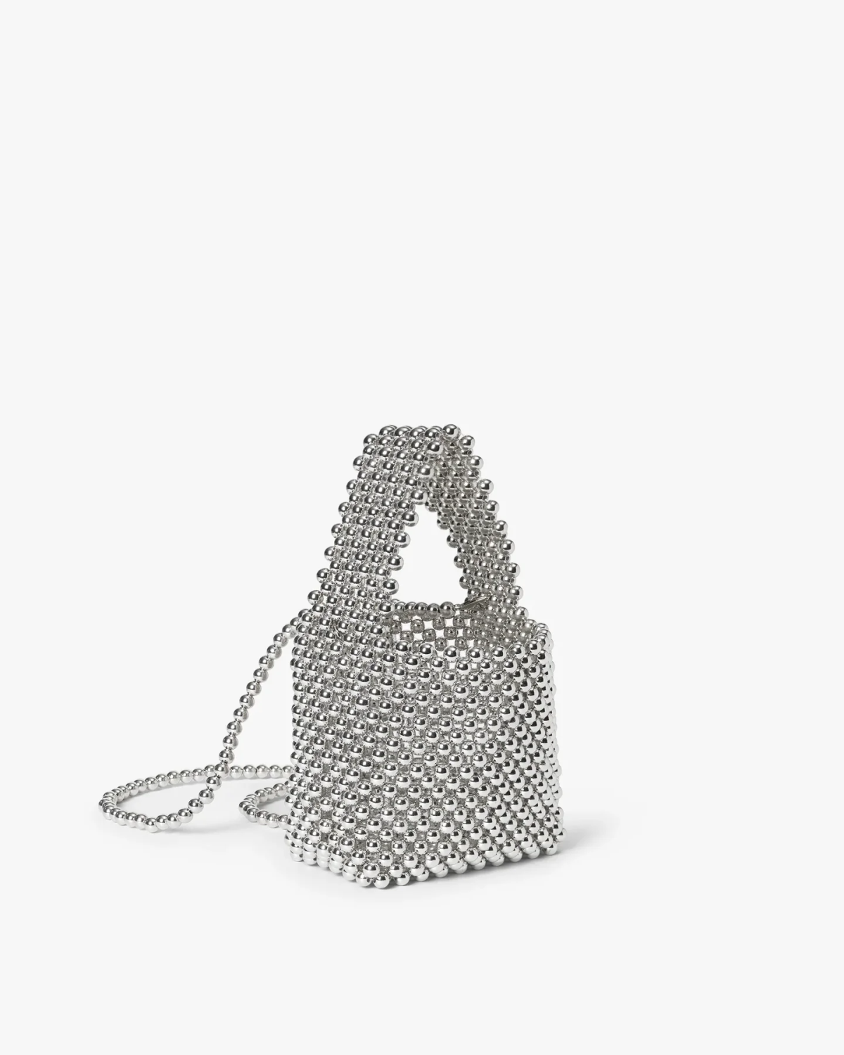 Denne iøyefallende håndvesken er laget laget av skinnende, sølvfargede perler som gir en slående krom-effekt. Det detaljerte perlearbeidet og den strukturerte, nette fasongen gir et luksuriøst og festlig uttrykk, perfekt for sesongens selskaper. Vesken har både et elegant topphåndtak og en lengre skulderrem som kan tas av.