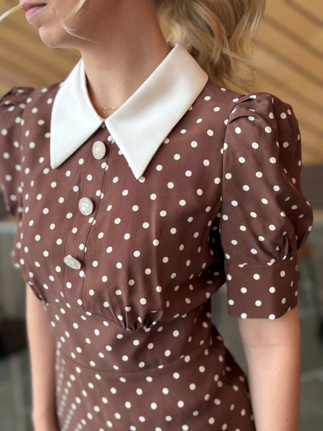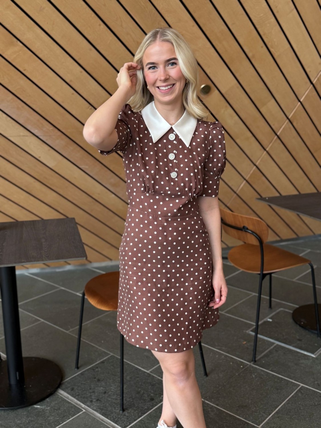 En nydelig brun minikjole med prikkende print i offwhite. Kjolen har krage, korte puffermer med mansjetter og lukkes med dekorative knapper på brystet. Den markerte midjen blir fremhevet på en elegant måte og gir deg en flatterende passform.