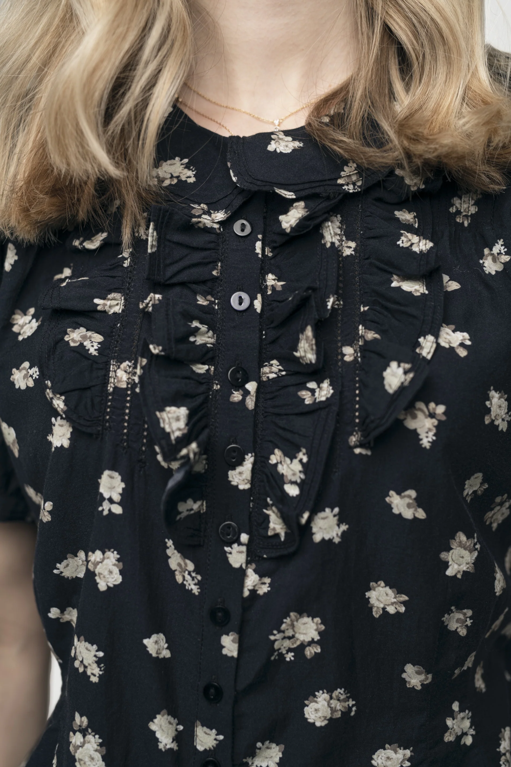 Nydelig bluse med korte puffermer, avrundet krage og rysjer nedover blusen. Knappelukking foran.