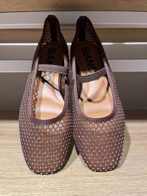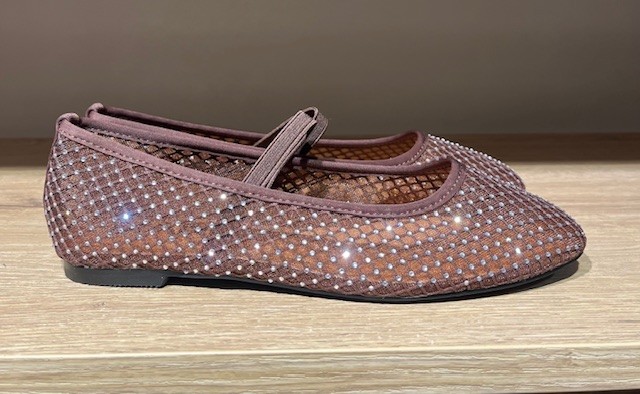 Supefine ballerinasko i en lekker brunfarge. Skoene har rund tå, lav hæl og en stropp over risten med spenne som gir en behagelig passform. Små blanke stener som gir det lille ekstra.