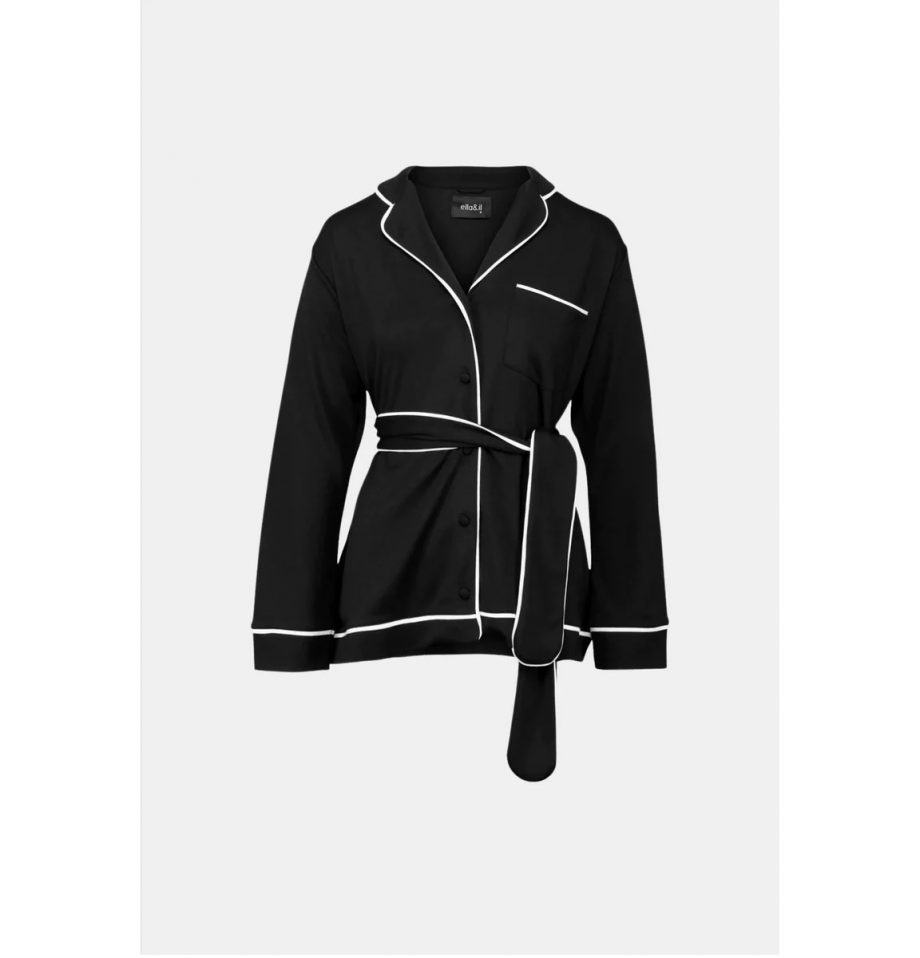 En komfortabel og elegant pysjamas med lekre detaljer, laget i de mykeste materialene. Buksene er rette og overdelen har en løs passform med knytebelte i midjen. Modellen er 178 cm og har på seg en størrelse S.