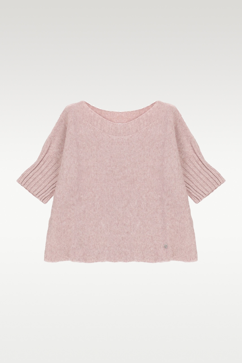 En ny vri på den populære go-genseren fra italienske Please. Denne varianten kommer med elegant boatneck-hals, korte ermer og ribbestrikkede detaljer i hals og ermeavslutning. Den skråskårne kanten gir et nett og moderne uttrykk som faller pent på kroppen.