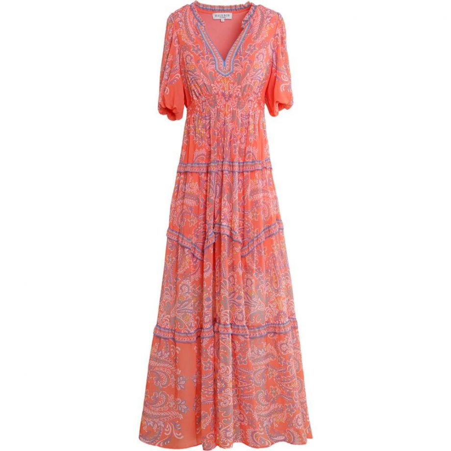 En fresh og fargerik maxikjole som løfter sommergarderoben. Kjolen har en oransje nyanse med signatur-paisley og blå kontrastbånd fremhever kjolen figuren med en komfortabel, elastisk midje. Dyp V-hals med delikat rynkekant og korte puff-ermer med strikk. Skjørtet faller lett i flere lag med volang- og kappepartier som skaper bevegelse. Det glatte polyestermaterialet er lett, luftig og krøller lite.