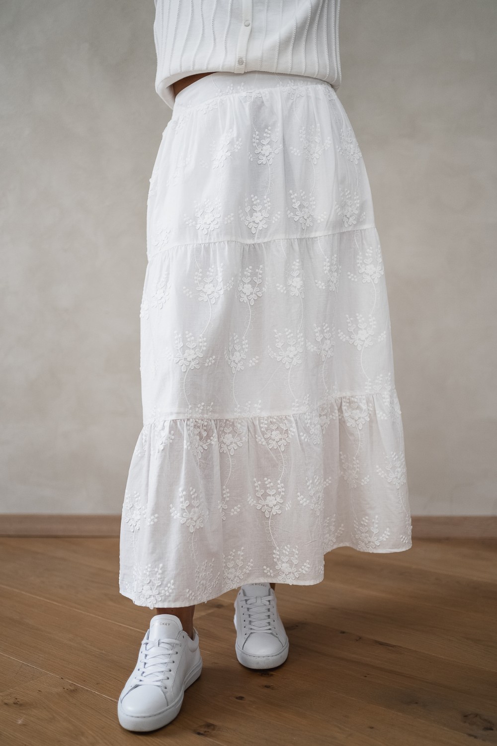 Nydelig midiskjørt i hvit farge med ton i ton broderte blomster. Skjørter har strikk i midjen som sørger for en flatterende og behagelig passform. Skjørtet er perfekt å matche sammen med Camilla 2/4 Shirt EMB.