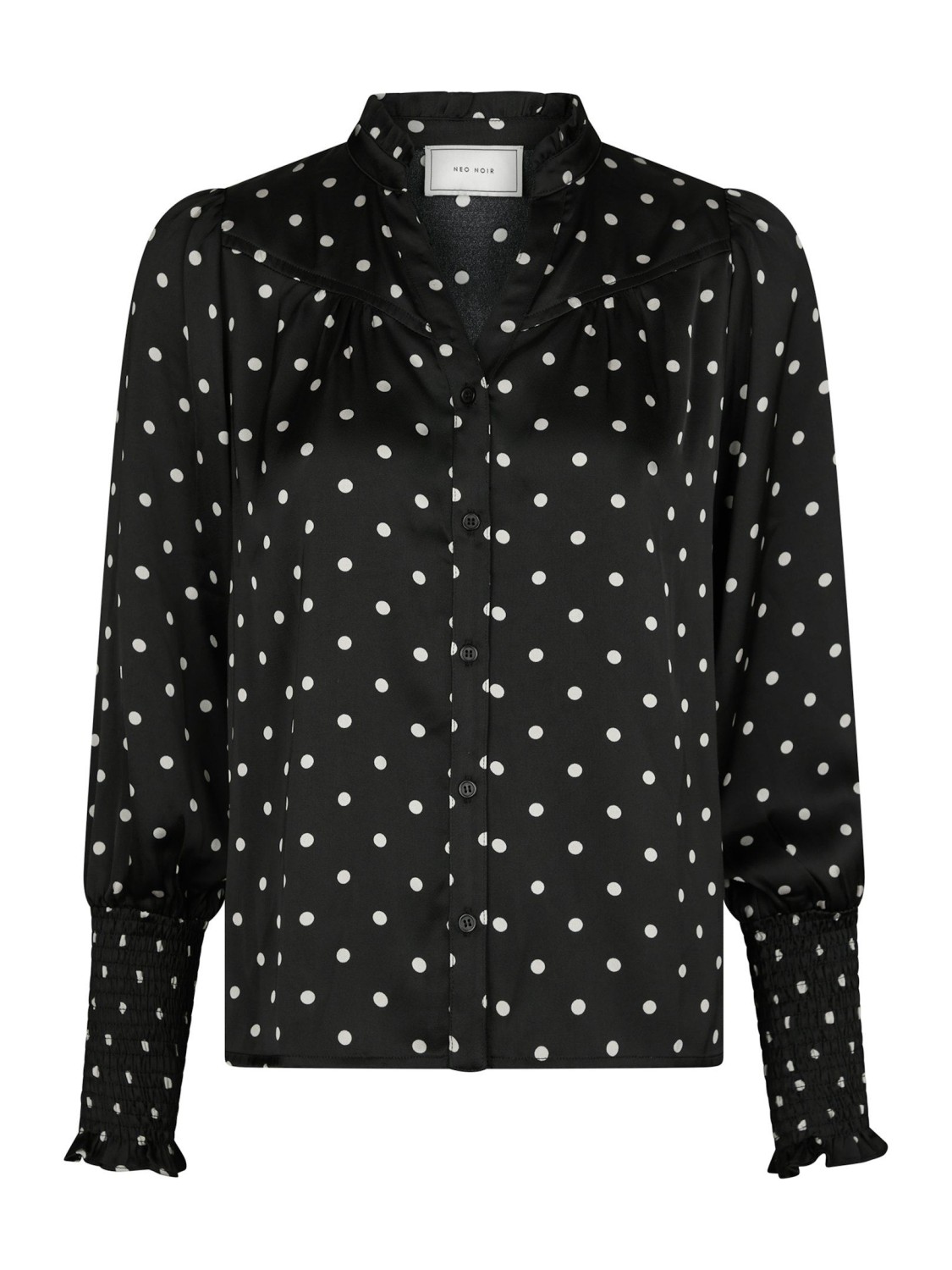 Blusen har lange ermer med smock nederst og et flatterende prikkemønster.