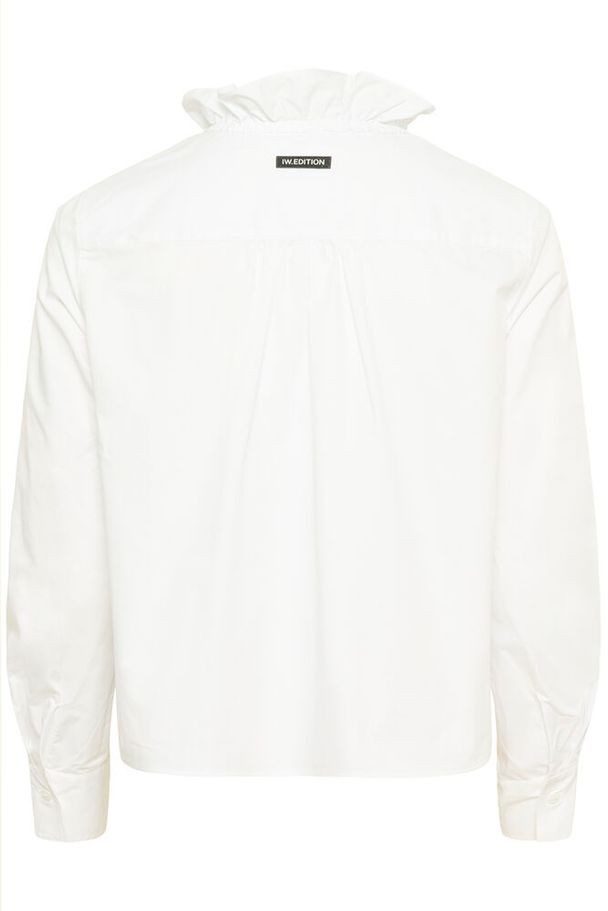Hvit skjorte med volangkant i halsen og langs knappestolpen i front.