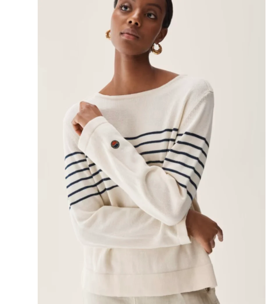 Klassisk genser laget av mykeste bomull, detaljert med blå striper for et maritimt preg. Genseren har rund hals og lange ermer.