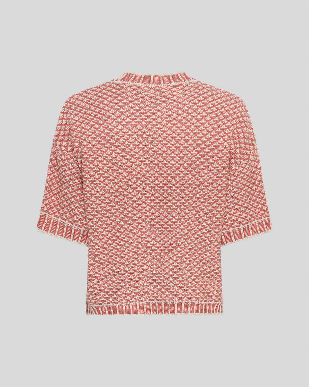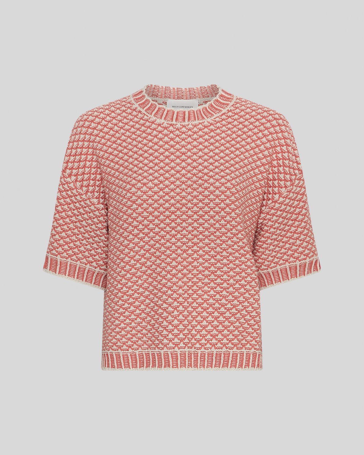 Strikket genser med grafisk mønster og avslappede korte ermer. Ribbekanter ved halsutringning, ermer og fald for et rent og moderne utseende. Et lettstylet plagg som passer til både avslappede og lag-på-lag-antrekk.