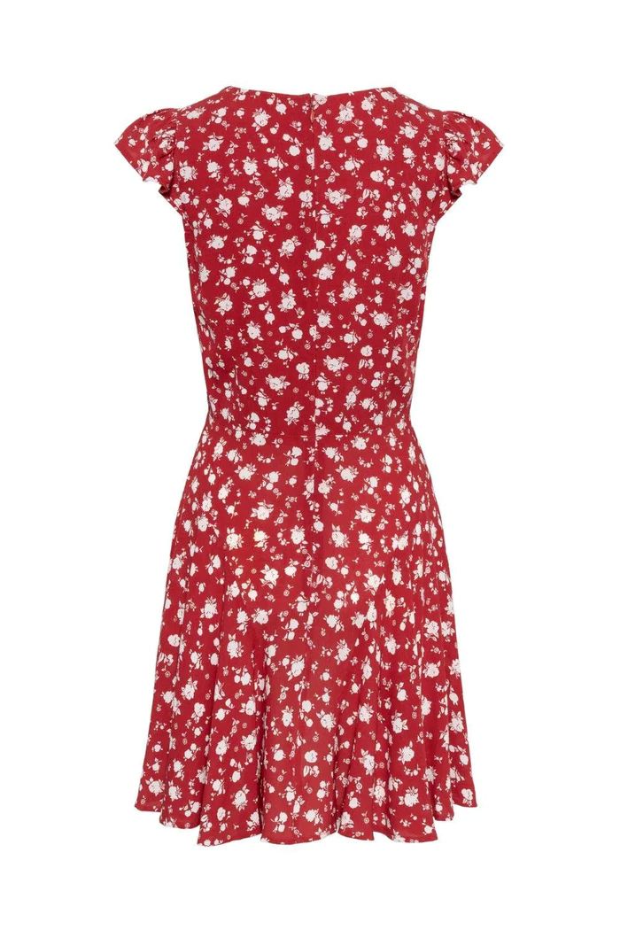 Cherry Annecy er en feminin minikjole designet med korte puffermer og en flatterende hjerteformet halsutringning. Den tettsittende overdelen med myk rynking under bysten fremhever silhuetten, mens det lett utsvingte skjørtet gir bevegelse og avslappethet. Laget i Pias signatur Annecy-trykk i en livlig rød tone, er dette et lekent, men likevel polert plagg.