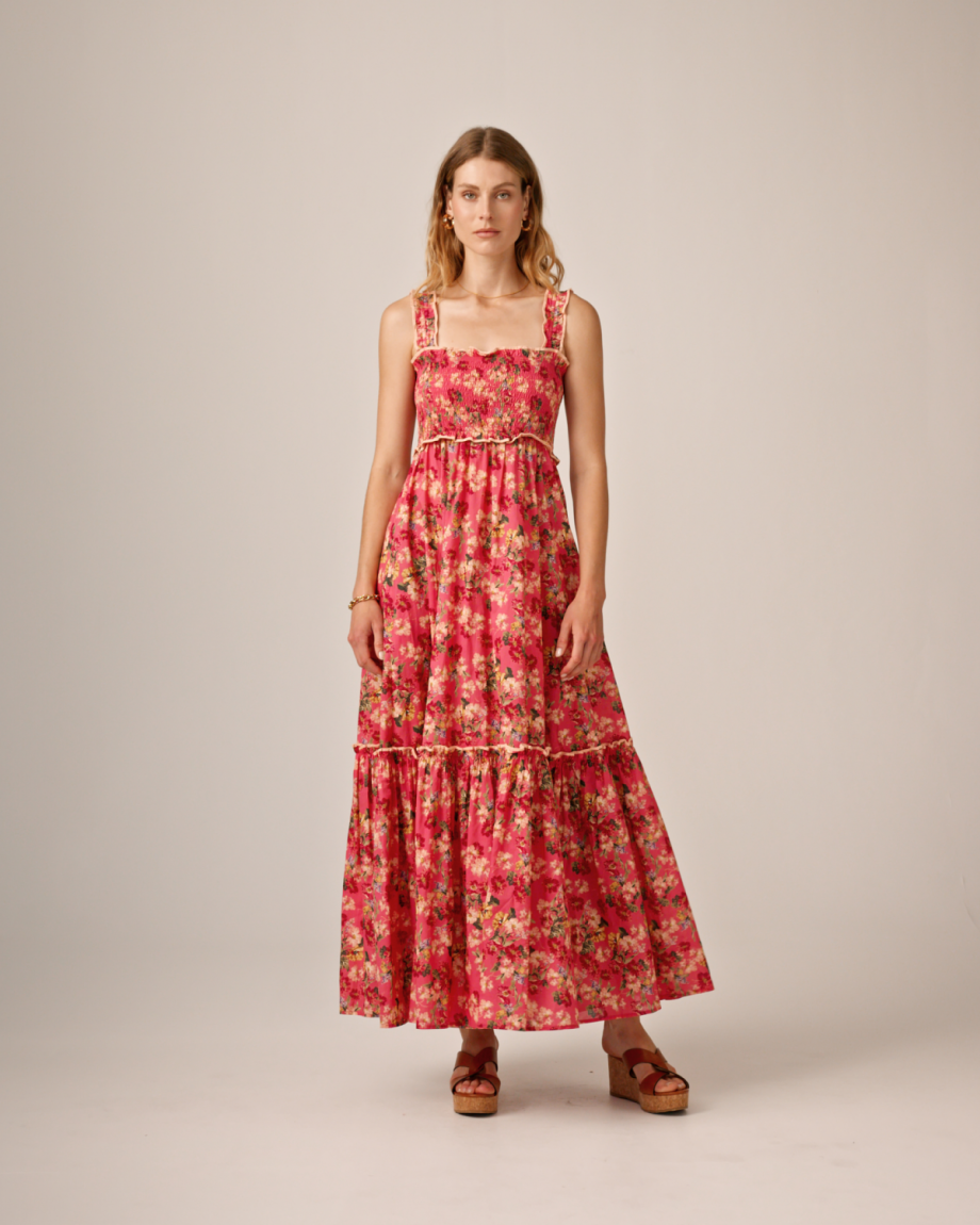 Nydelig kjole kuttet i den veldig myke og pustende BCI-sertifiserte bomullen. Den har en midi-lengde, tilpasset tubetopp laget av elastisk smock og et flytende skjørt. Volangen nederst på skjørtet gir kjolen mye bevegelse.