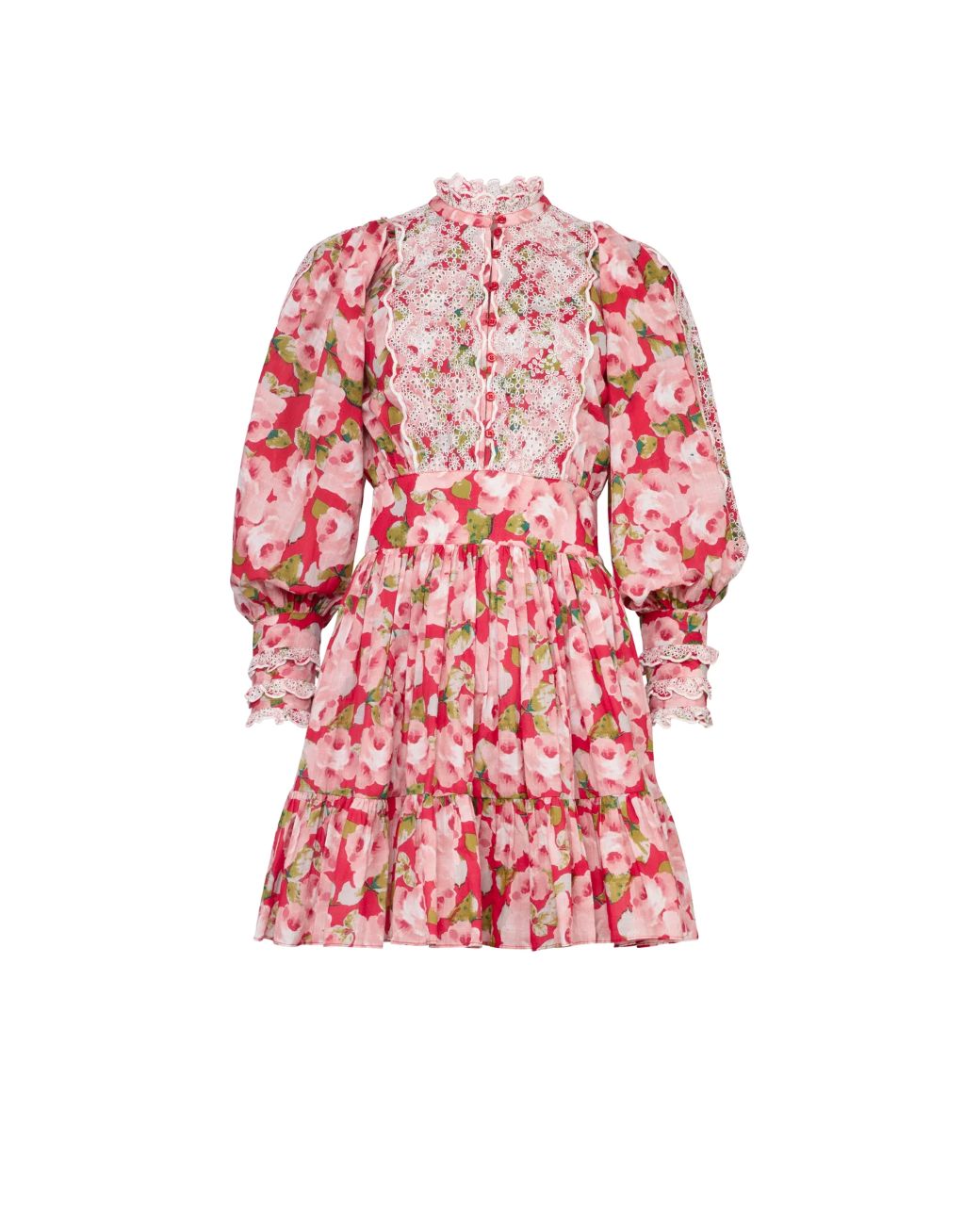 Kjempefin minikjole i et rosa blomsterprint. Kjolen har markert midje med smock i ryggen for en fleksibel passform, og en A-formet skjørtedel med rynker og volang nederst. Fronten prydes av knappestolpe, mens høy rysjekrage og vakre broderie anglaise-innlegg på bryst, ermer og mansjetter tilfører vintage-følelse. Overdimensjonerte puff-ermer balanserer den korte lengden – perfekt til alt fra hverdag til sommerfester.