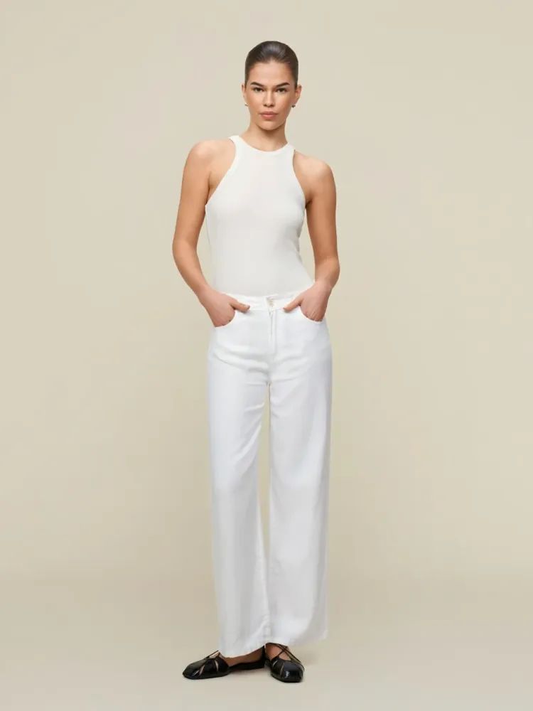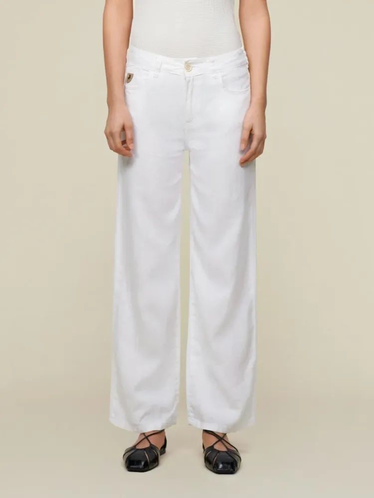 Culotte Linen Summer er en komfortabel og stilren culotte-bukse med et tidløst uttrykk. Den er laget av 100 % lin, som gir en lett og pustende kvalitet – perfekt for varmere dager. Buksen har høyt liv, rette vide ben i ankellengde og klassisk 5-lommersdesign med beltehemper. Den lukkes med knapp og skjult glidelås i front, og har en diskret skinndetalj med logo bak.