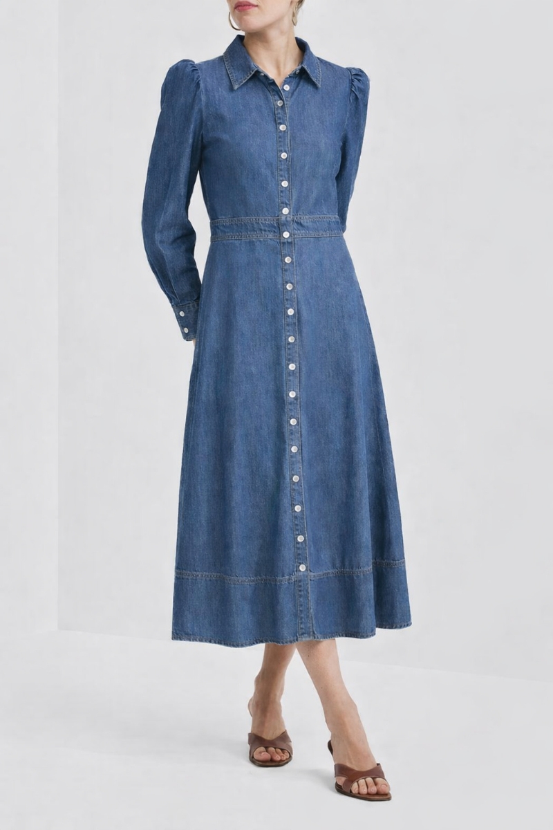 En lekker, tidløs denimkjole som løfter hverdagsgarderoben. Denne nydelige kjolen i fargen French Blue kombinerer et klassisk snitt med byTiMos romantiske signaturstil. Kjolen har en flatterende midi-lengde, elegant skjortekrage og gjennomgående knapping i front som gir et rent uttrykk. De lange ermene har markante puffdetaljer på skuldrene og brede mansjetter som skaper en sterk, men feminin silhuett. Et bredt, innsvinget midjeparti fremhever figuren før skjørtet skråner ut i en vid A-form.
