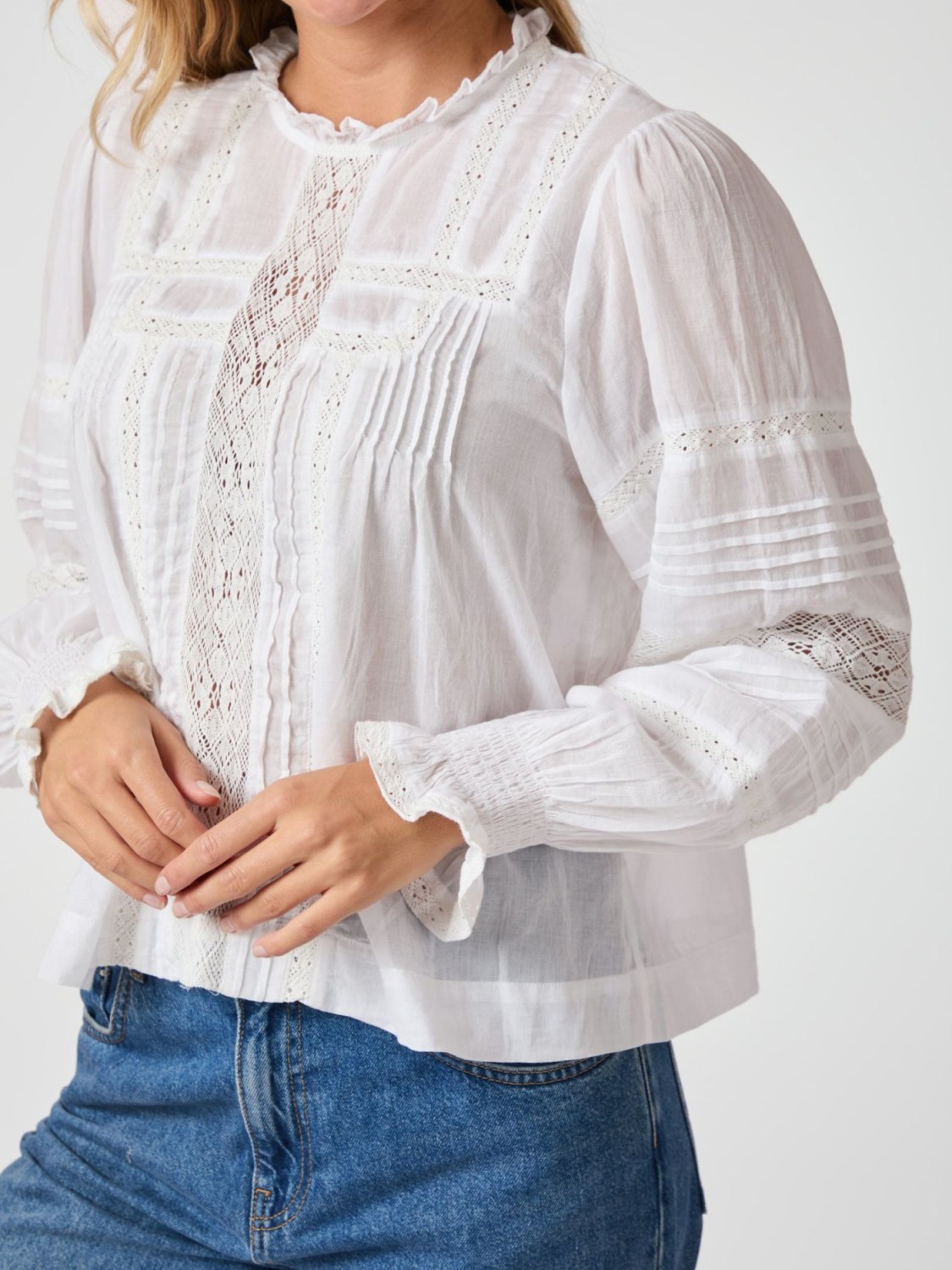Vakker bluse i bomullsvoile med dekorative tape og detaljer. Løs, men feminin passform.