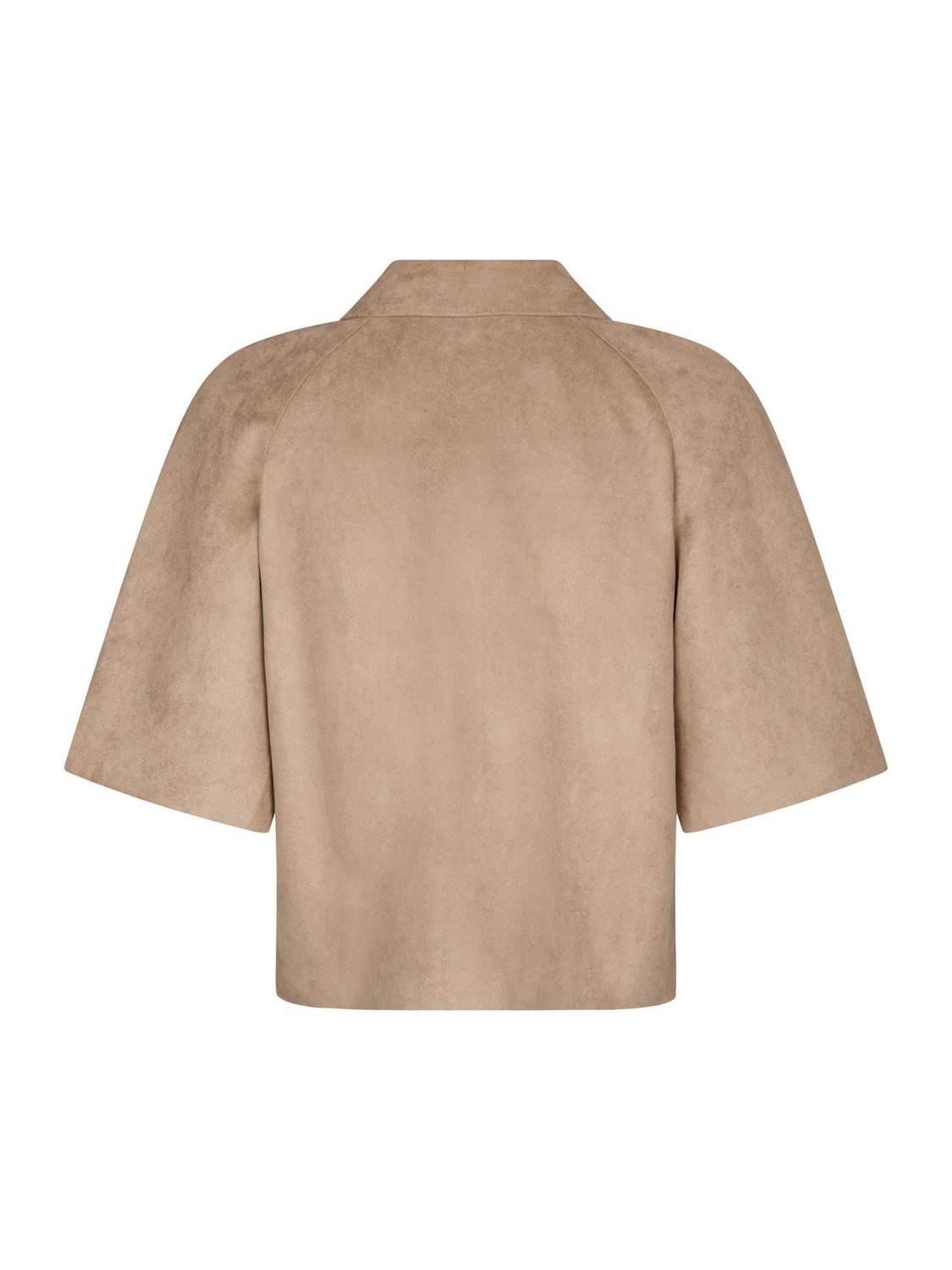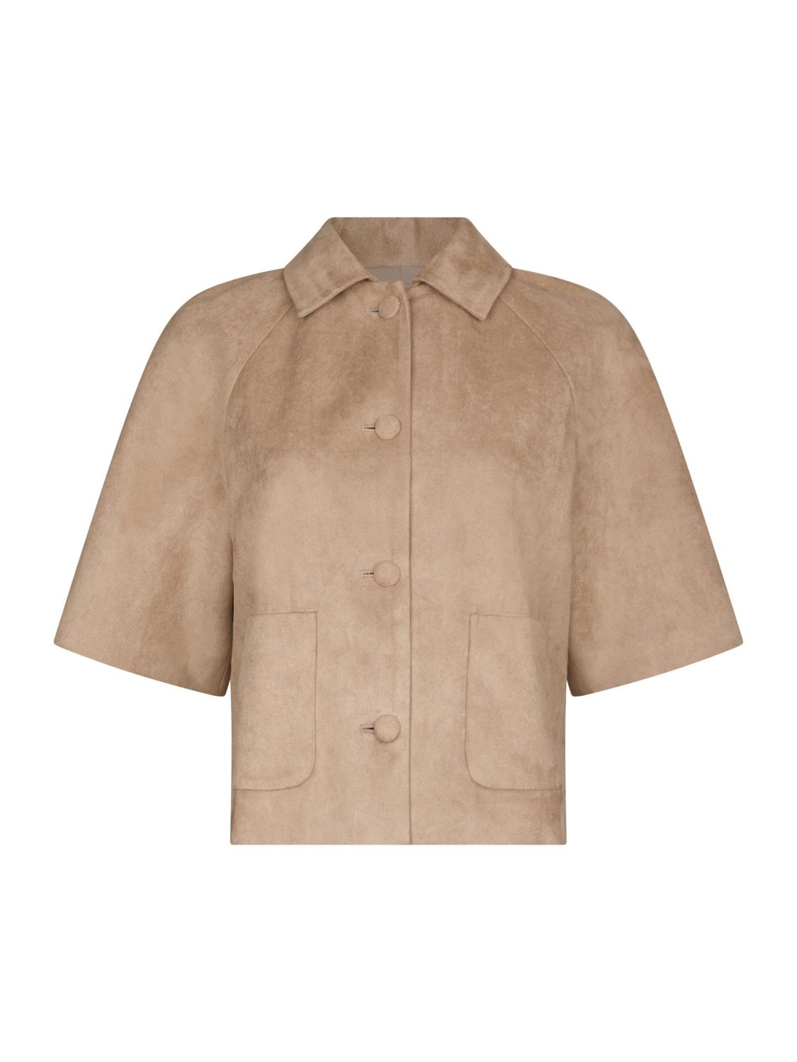 En kort, stilren jakke i sandfarget faux semsket. Den myke, semskede teksturen gir et elegant preg, og den lette kvaliteten gjør den perfekt til vår og sommer. Jakken har klassisk krage, raglanfelling og albuelange ermer. Stofftrukne knapper og to store frontlommer understreker det rene uttrykket. Rett, litt boxy passform som fungerer over kjoler, denim og skreddersøm.
