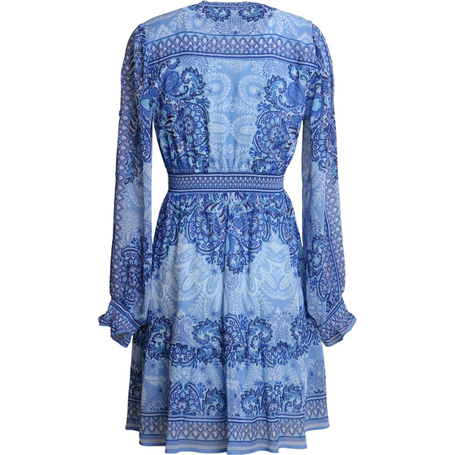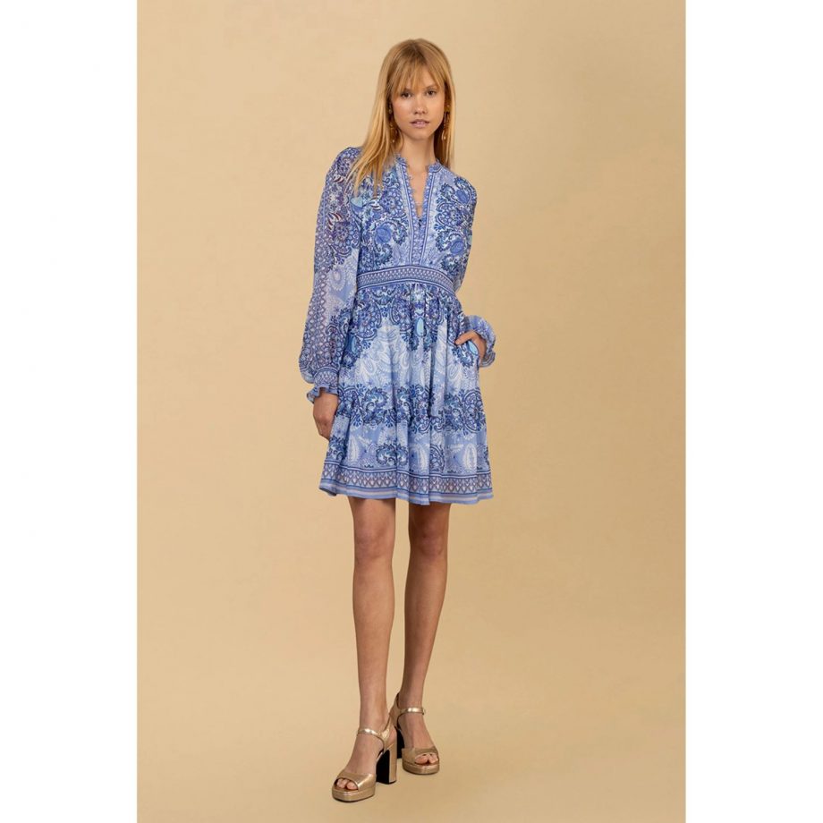 Lekker chiffon-minikjole med V-hals og lange ermer. Knappelukkingen midt foran passer perfekt til en smockkant i midjen som fremhever silhuetten din, mens det lagdelte skjørtet gir bevegelse og dimensjon. Praktiske lommer i sidene.