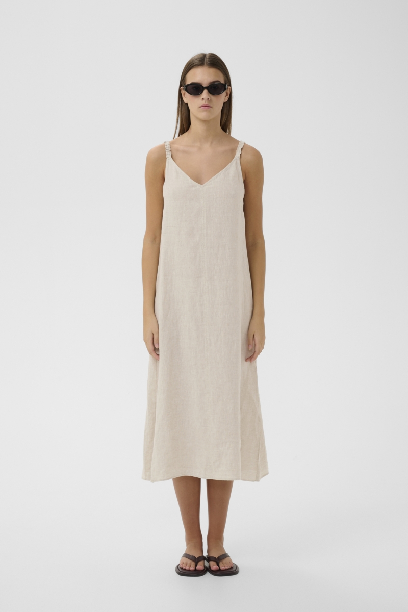 Den enkle V-utringningen og de fine stroppene gir et feminint uttrykk, mens det rene designet gjør kjolen enkel å style til enhver anledning.