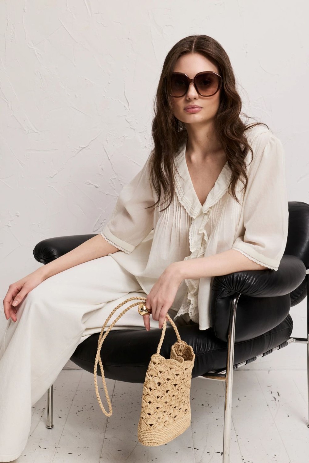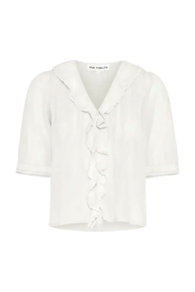 En nydelig bluse laget av bomull og viskose som gjør at den føles svært behagelig på. Blusen har korte ermer, V-hals med rysjedetaljer og mange små leggdetaljer som gir den mye vidde. Den kommer i hvit farge og har små broderidetaljer på ermene. Den løse passformen gjør at blusen faller fint på kroppen.
