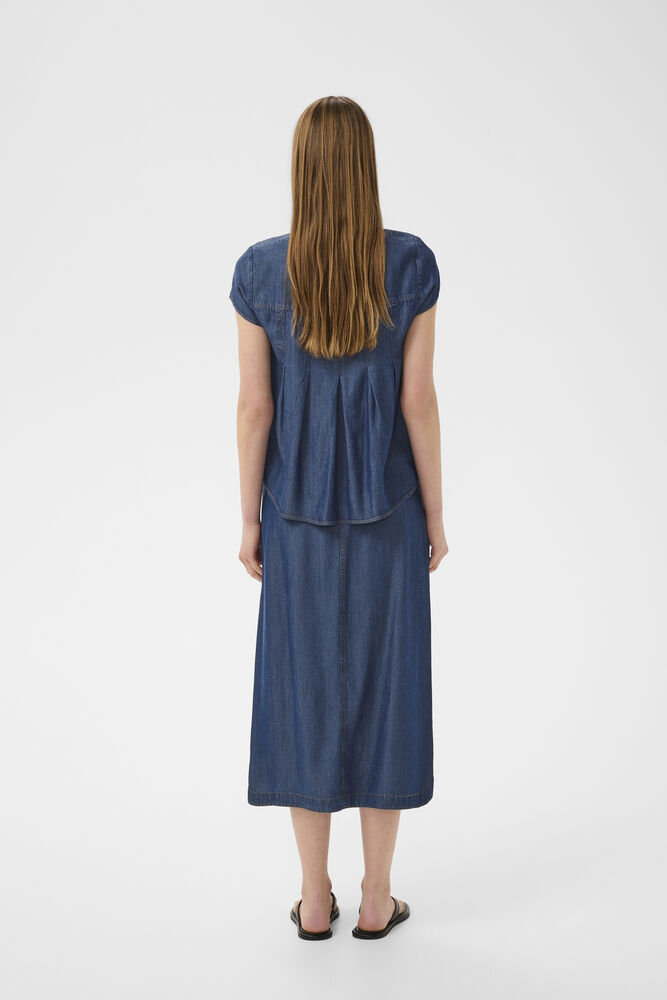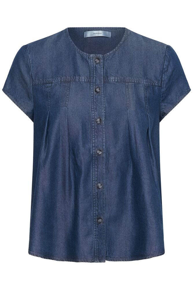 Delikat skjorte i en mørk blå denimfarge. Toppen har korte ermer, knappelukking i front og rund hals.