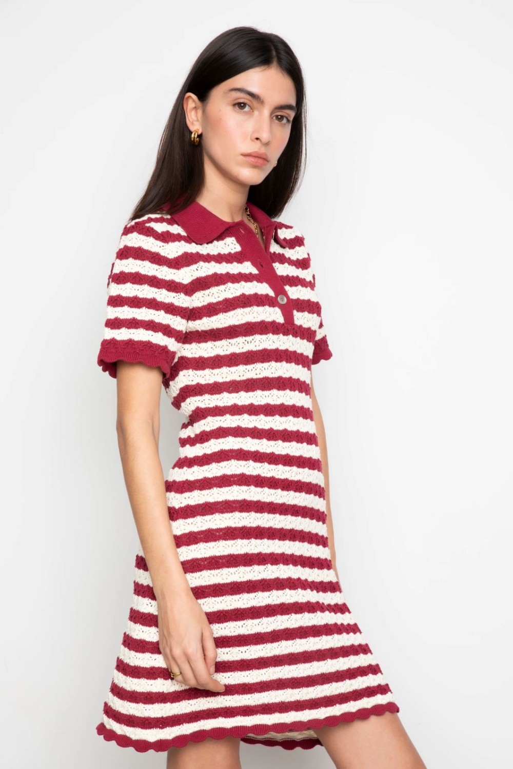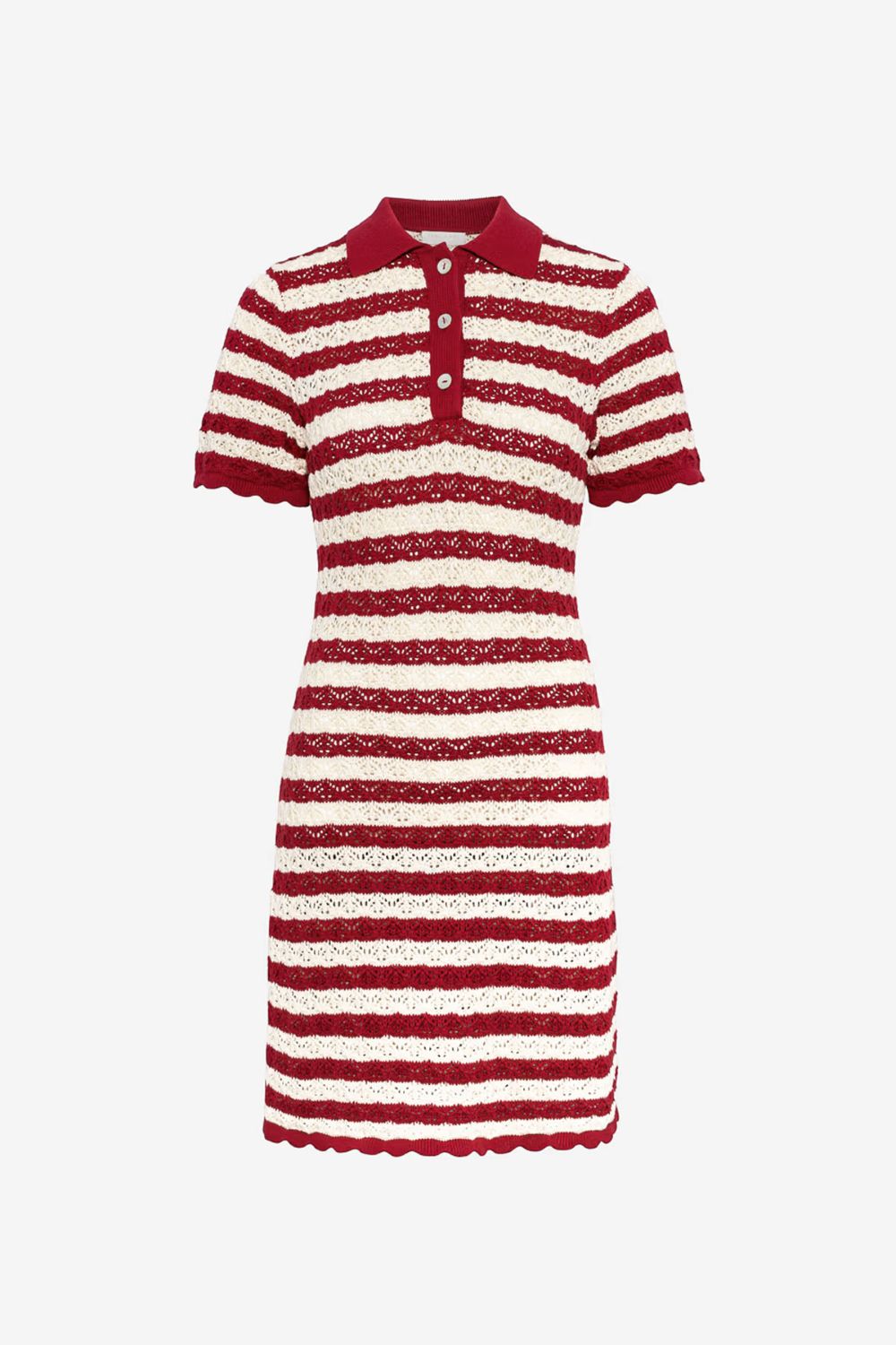 Emery-kjolen er laget av bomull i Camilla Pihls sesongbaserte heklede strikkemønster. Den er designet som en kortermet polokjole med en kort silhuett, og har tre knappelukkinger langs stolpen foran for et polert, moderne utseende.