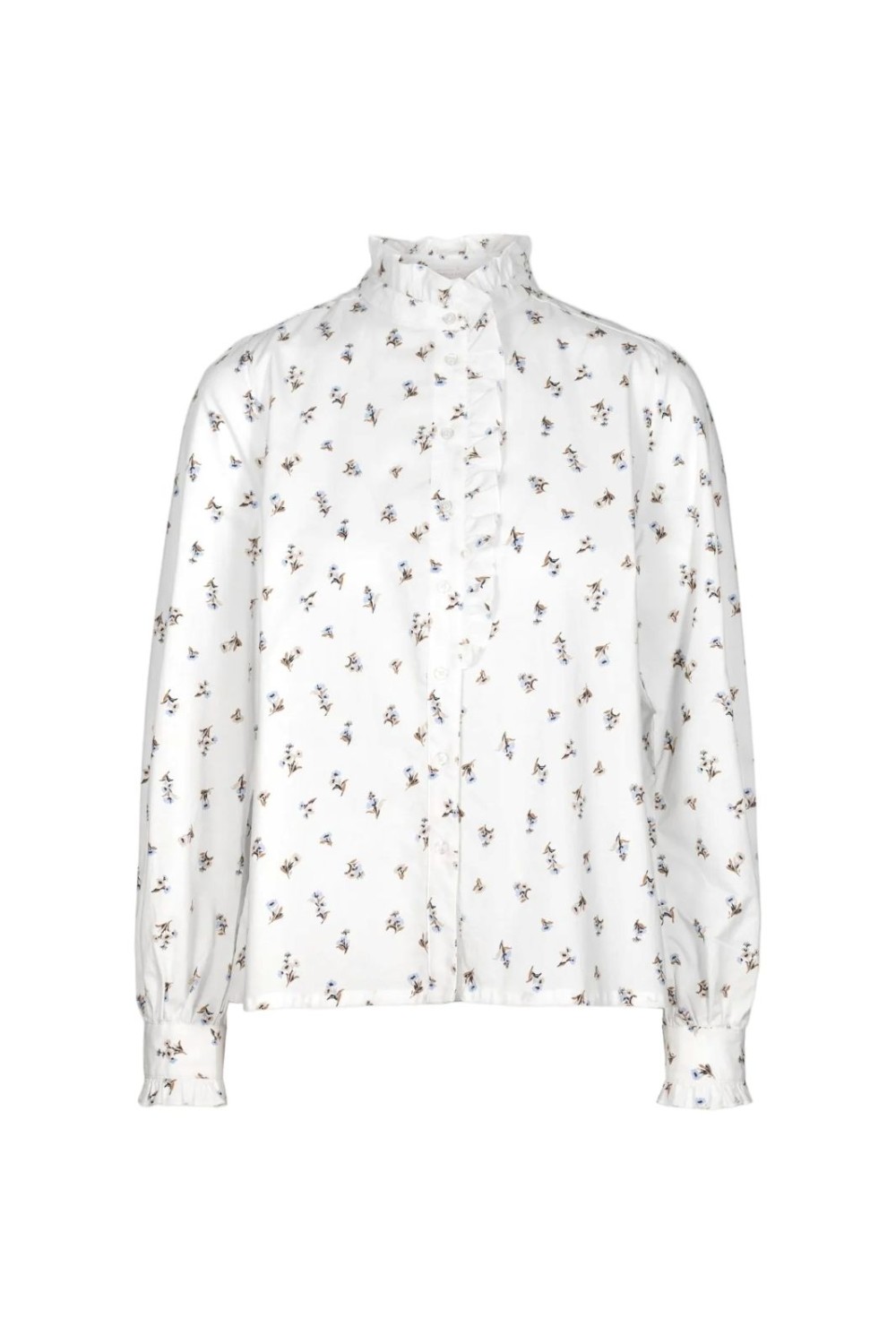 Denne fine blusen har et delikat blomsterprint og vakre volangdetaljer langs kneppingen, kragen og mansjettene. Blusen har en rett silhuett som komplementeres av volum nederst i ermene for en leken finish. Den lette bomullskvaliteten sørger for topp komfort gjennom hele dagen.