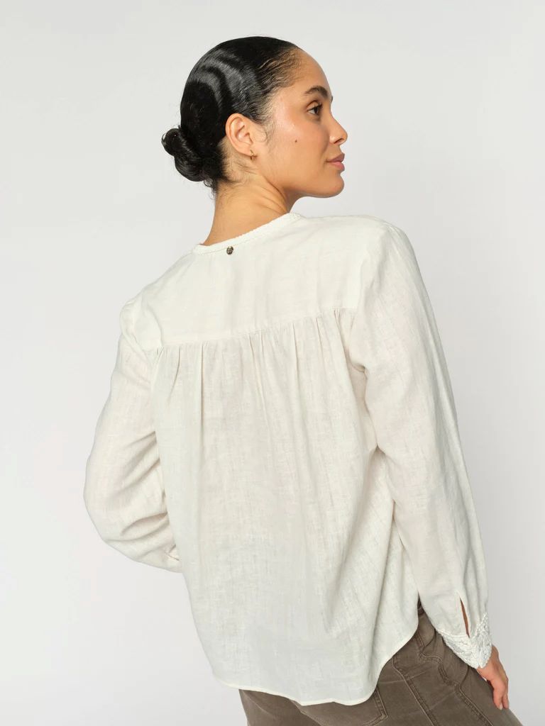 En vakkert detaljert bluse laget i en myk lin- og bomullsblanding. Designet i en avslappet silhuett med delikat broderie anglaise langs halsen og mansjettene, som tilfører et snev av eleganse til den naturlige teksturen. Style den med skreddersydde bukser eller denim for et raffinert, men uanstrengt uttrykk.