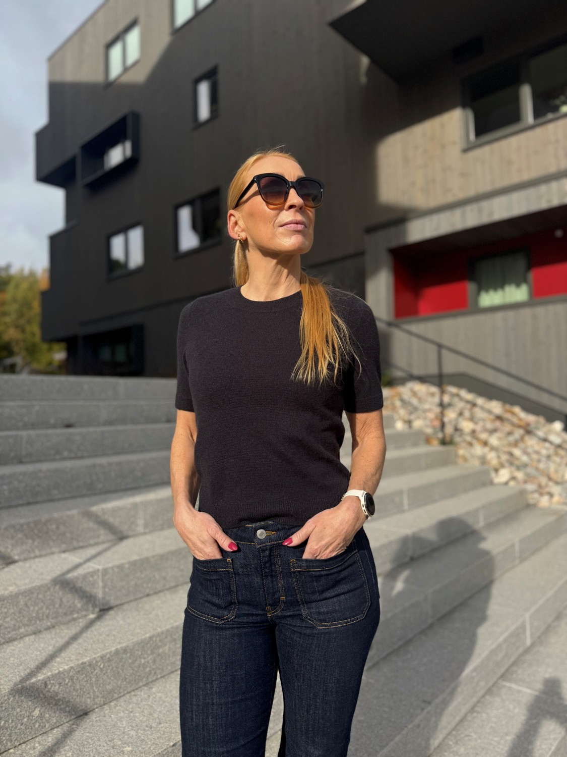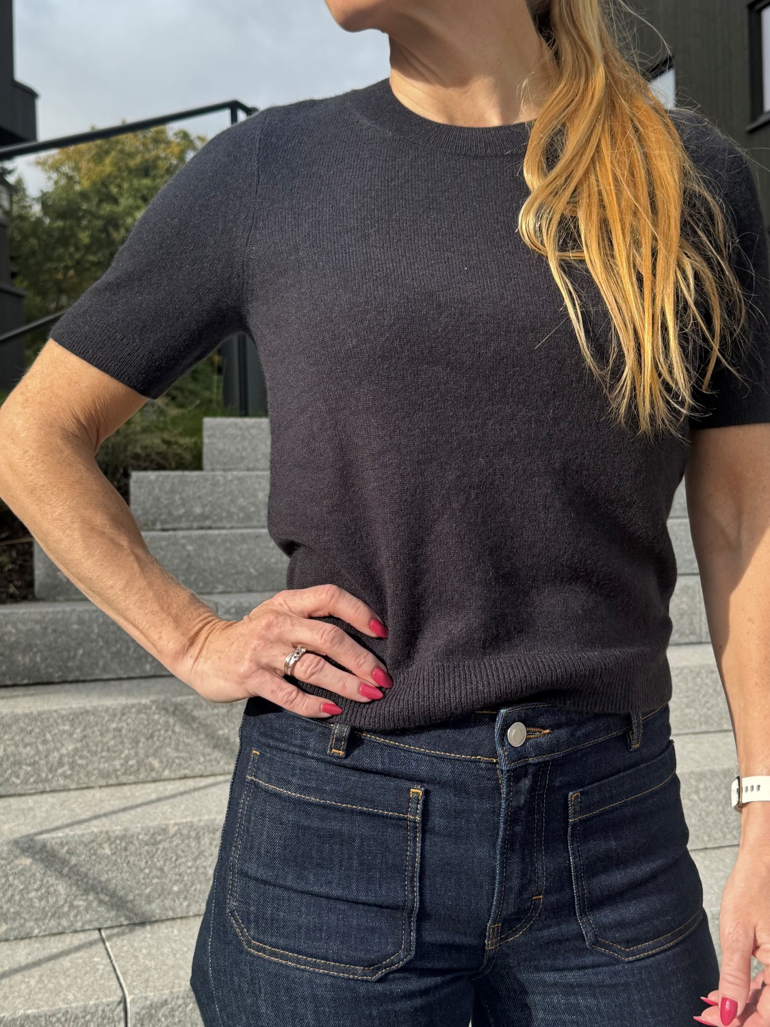 Superbehagelig cashmere genser med rund hals og korte ermer.