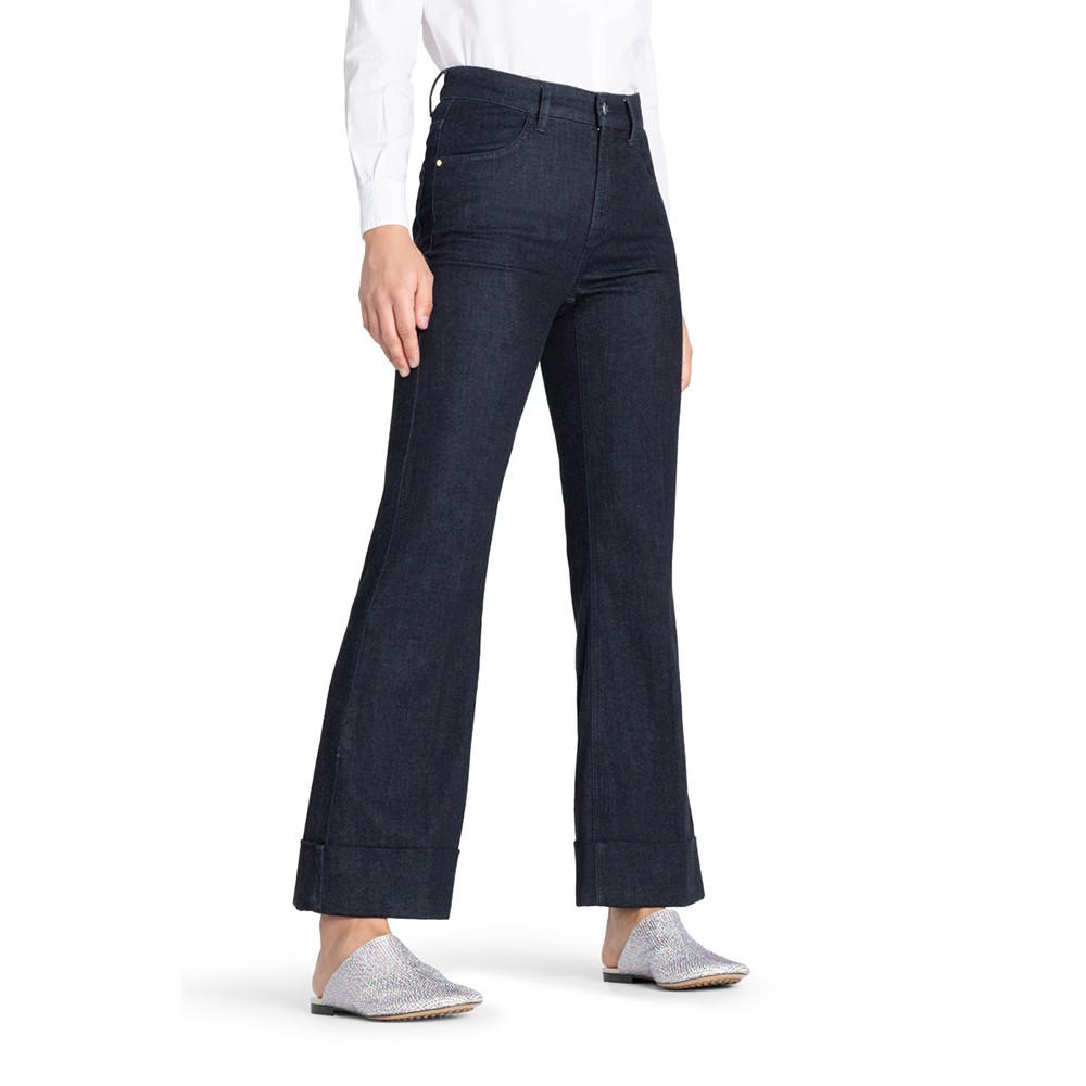 Jeansene har et klassisk 4-lommers design med en mørk vask som gir dem et sofistikert utseende. Den høye midjen gir god støtte og former midjen, samtidig som den skaper en elegant silhuett. Den lett utsvingte benfasongen balanserer kroppen og gir en flatterende effekt. Den oppbrettede kanten med en kul vri tilfører en moderne touch og gjør jeansene mer spennende.