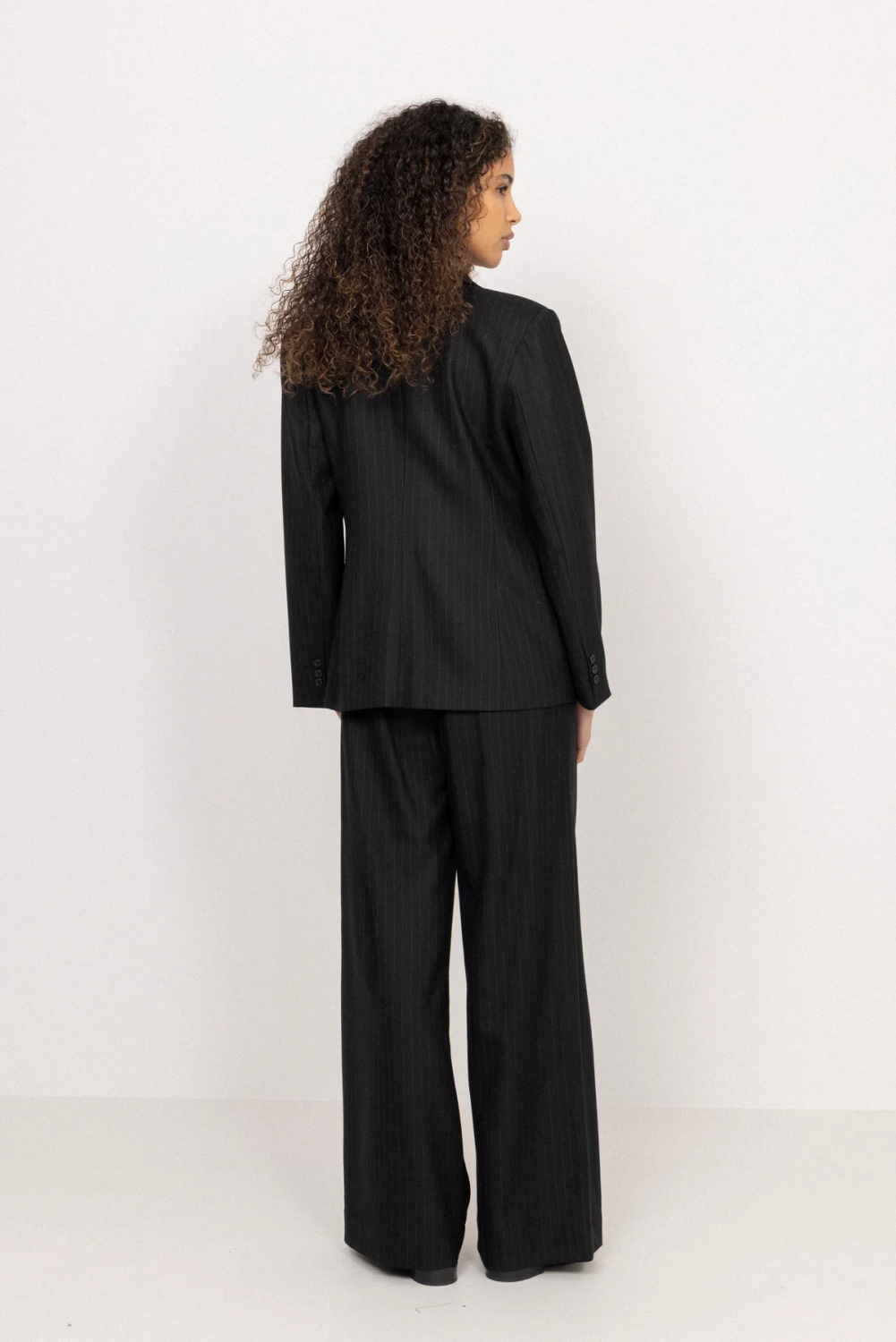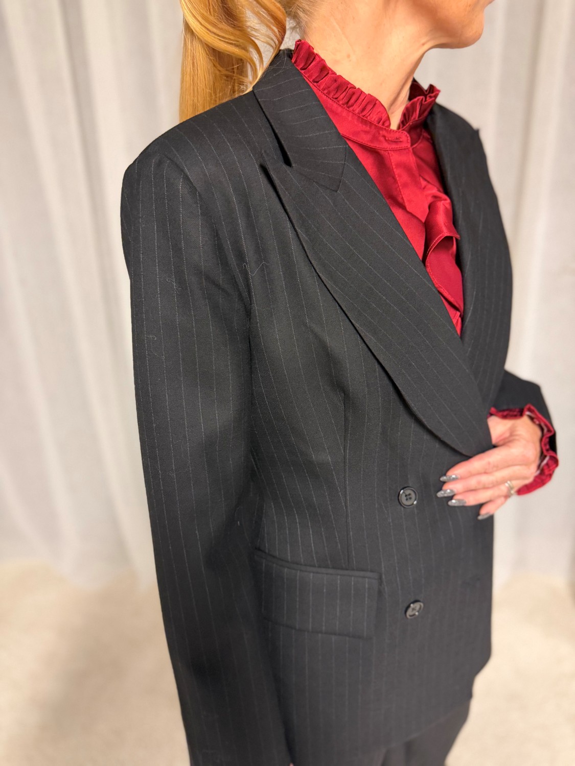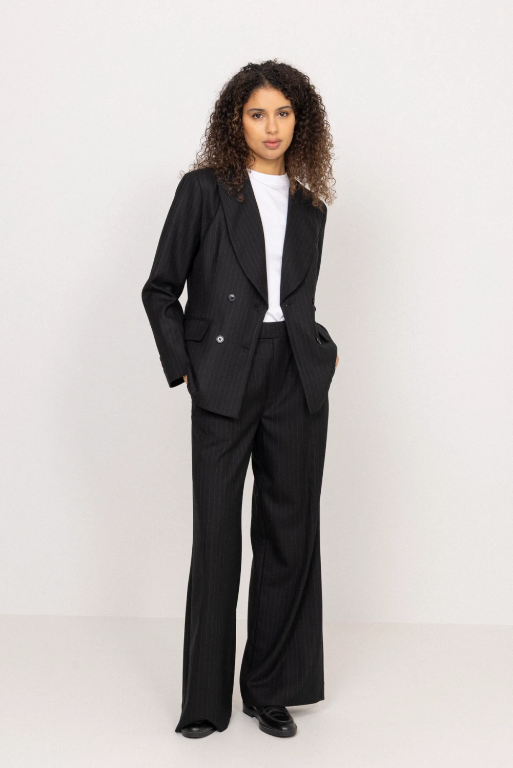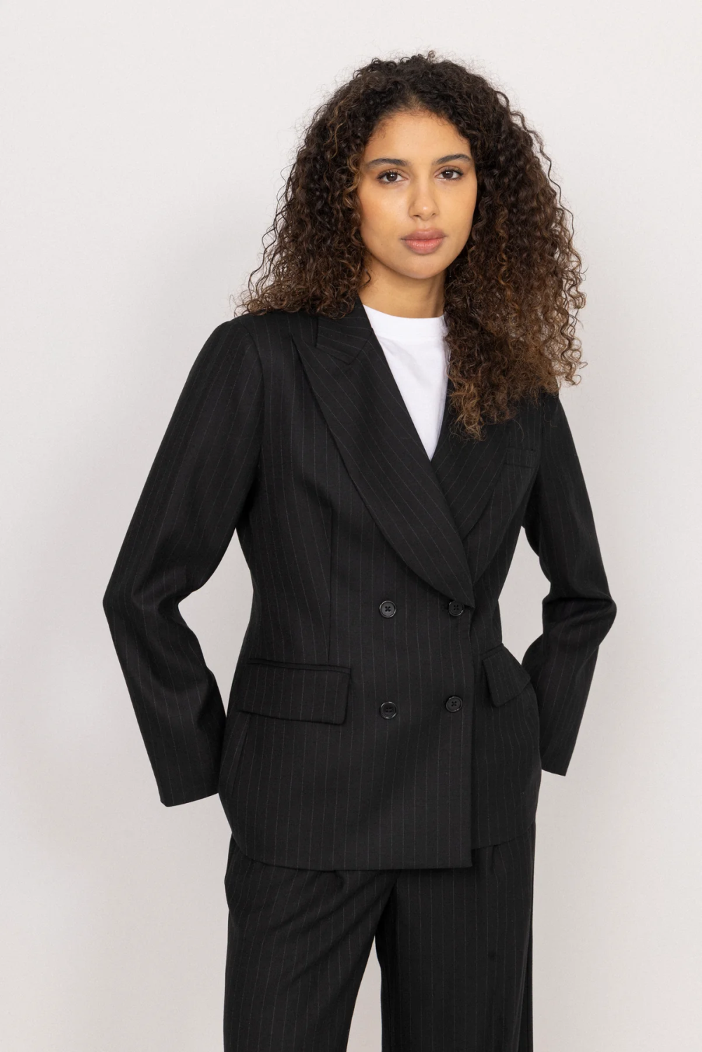 Denne dobbeltspente blazeren har en klassisk og sofistikert look med delikate pinstriper. Jakken er designet med en skreddersydd, men likevel avslappet passform, markerte skuldre og klassiske slag. Klafflommer i front fullfører det tidløse uttrykket. Laget i en eksklusiv ullblanding som sikrer både struktur og komfort. Style den med matchende bukser for et komplett power suit, eller over en enkel t-skjorte og jeans for en uanstrengt hverdagslook.
