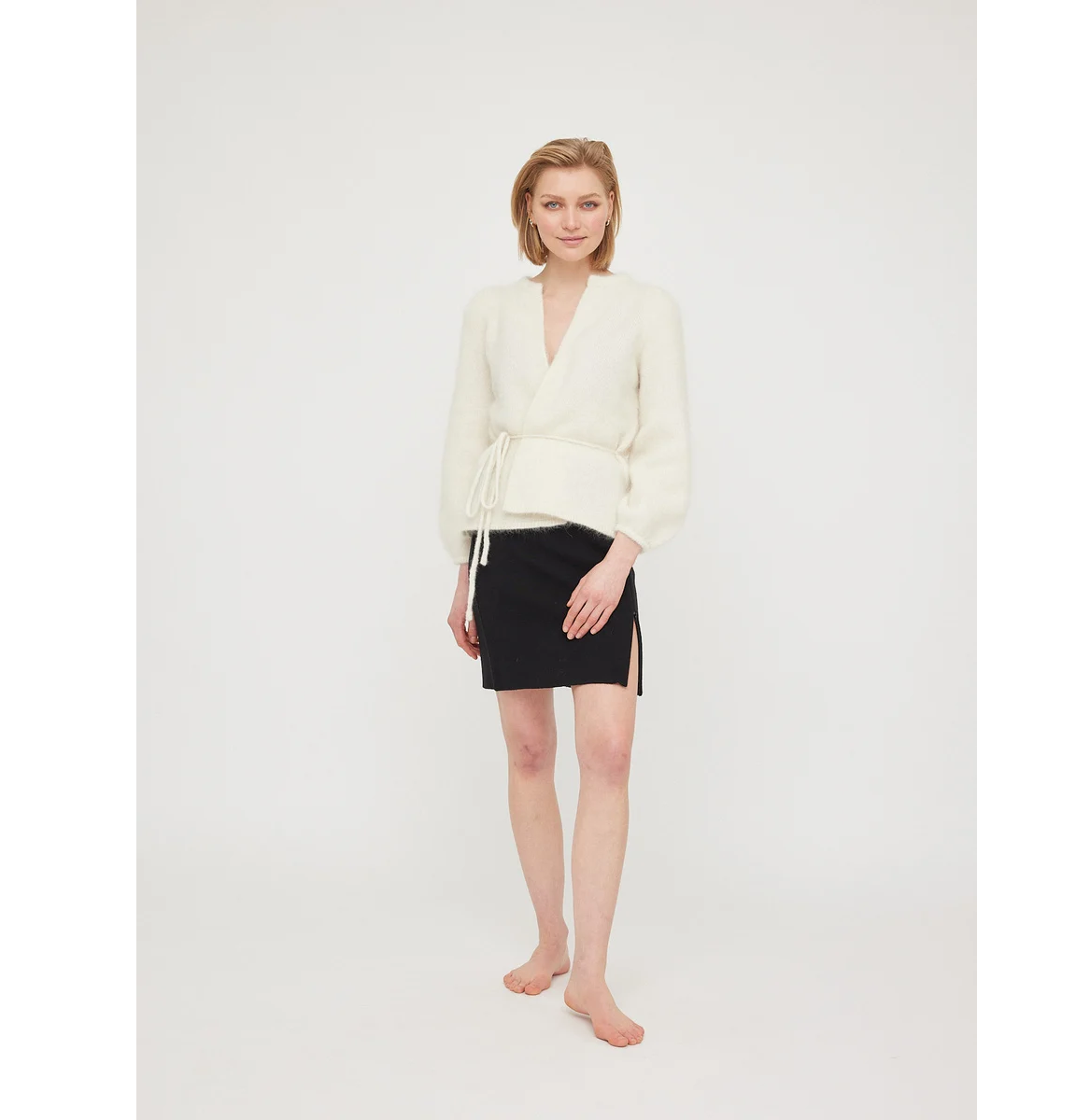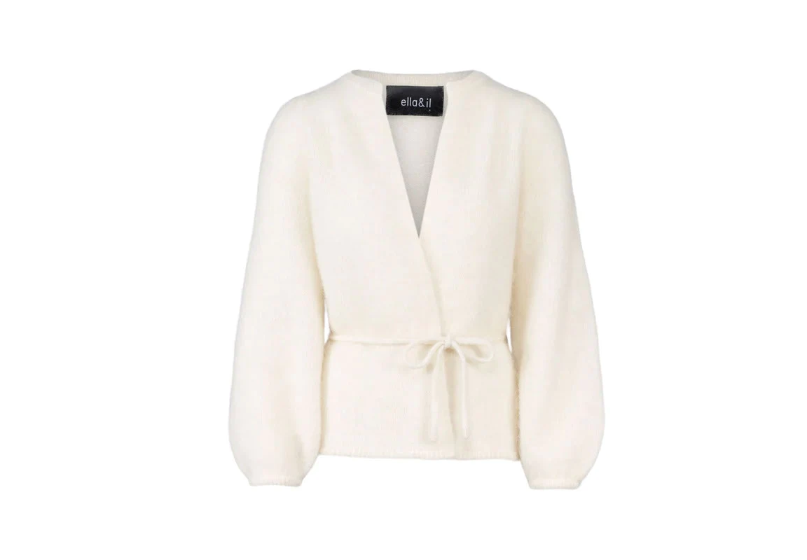 Nydelig cardigan med lange ballongermer og rund hals med feminin V-utringning. Cardiganen har omslagseffekt og knytebelte i livet, som gir en feminin og flatterende passform.