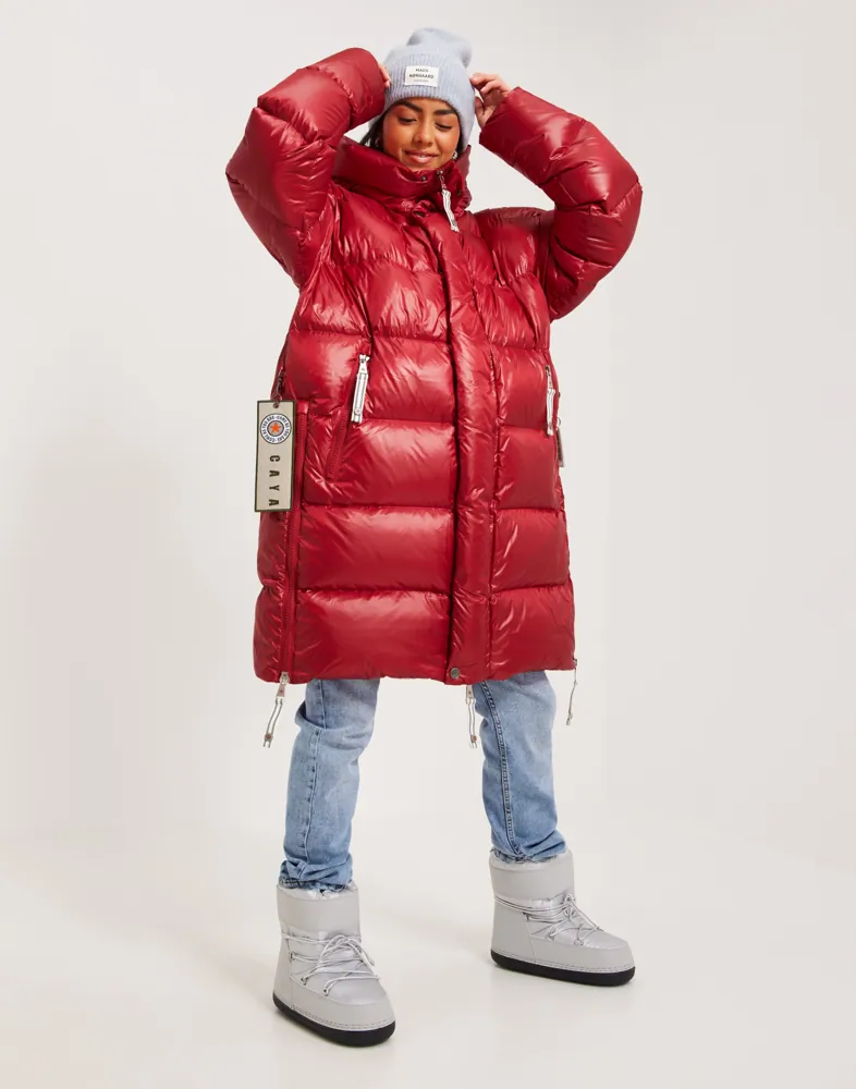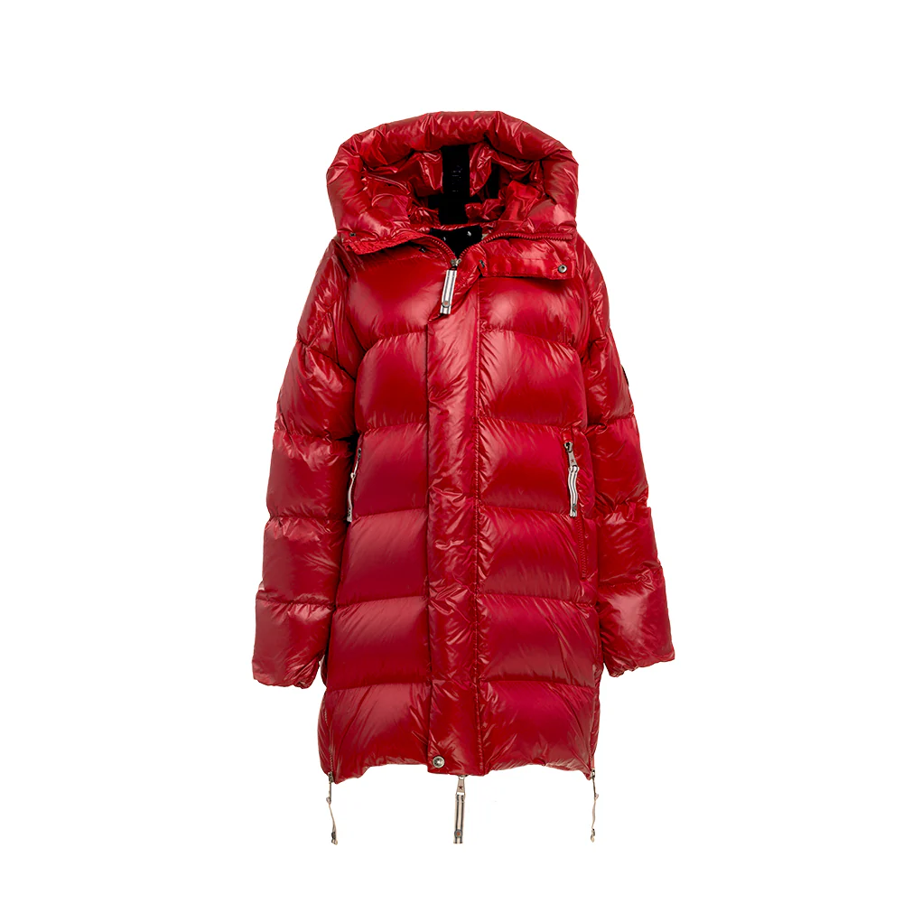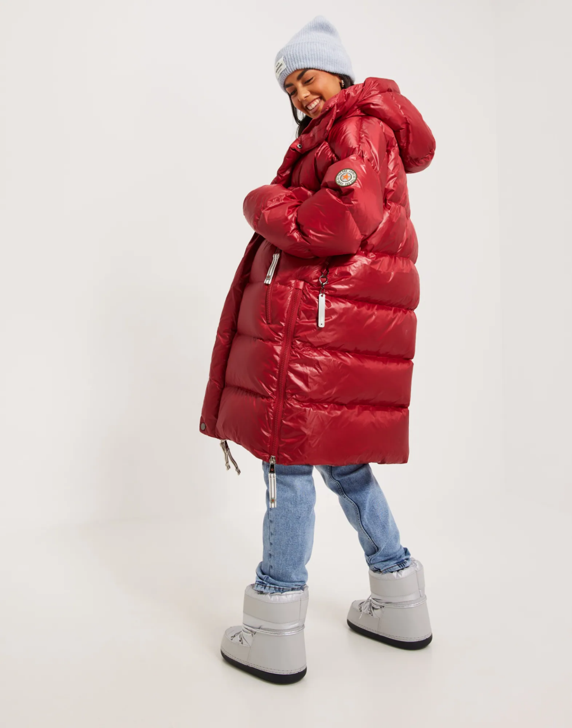 En superfin mellomlang dunjakke i en fresh rødfarge. Jakken har masse flotte detaljer – glidelås og knapper foran, hette, glidelås i begge sider og lommer foran med glidelås.