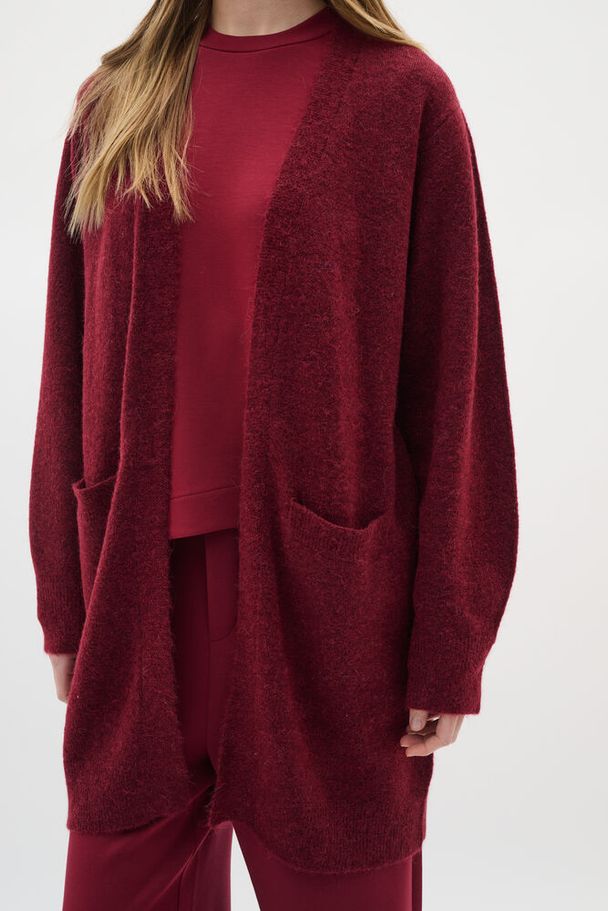 En myk og deilig cardigan i sesongens nydeligste burgundertone. Denne cardiganen har et åpent, rett snitt med senkede skuldre og romslige frontlommer – perfekt for lag-på-lag-styling.