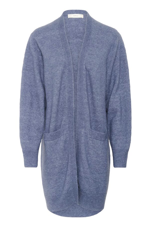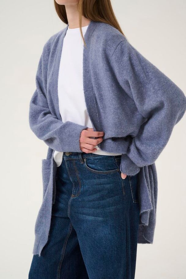 En myk og deilig cardigan i en lekker blåtone. Cardiganen har et åpent, rett snitt med senkede skuldre og romslige frontlommer – perfekt for lag-på-lag-styling.