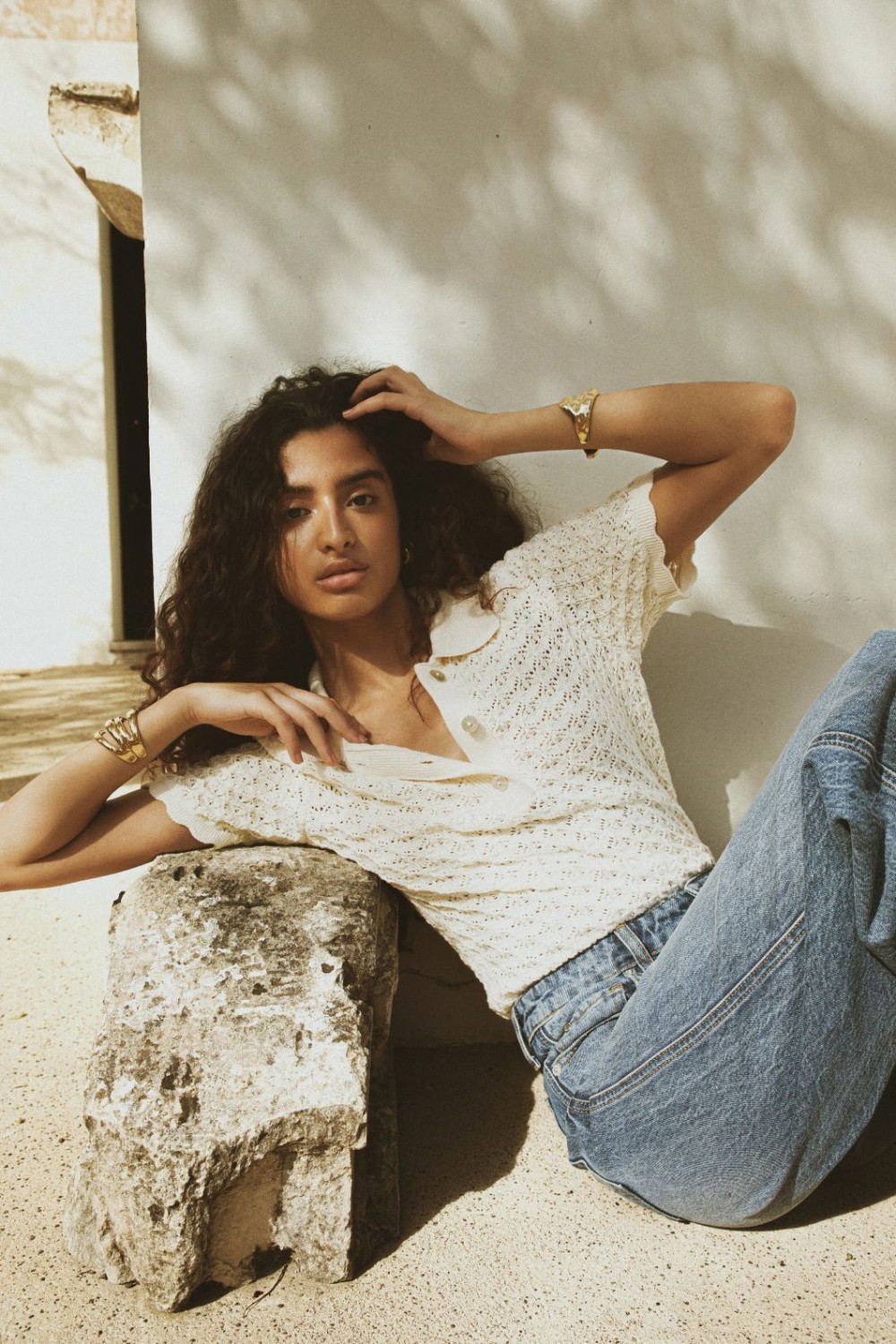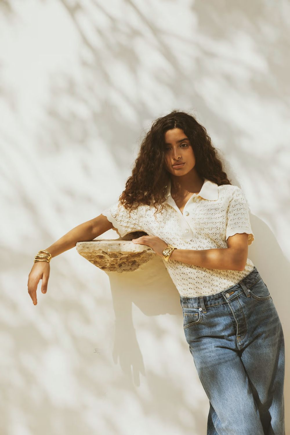 En kortermet poloskjorte laget av en bomullsblanding med et sesongbasert heklemønster. Den har tre knappelukkinger langs stolpen foran, og gir en moderne vri på en tidløs strikkeklassiker.