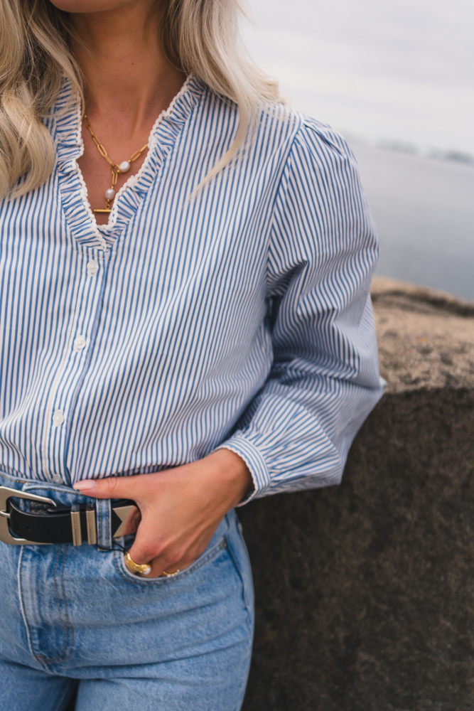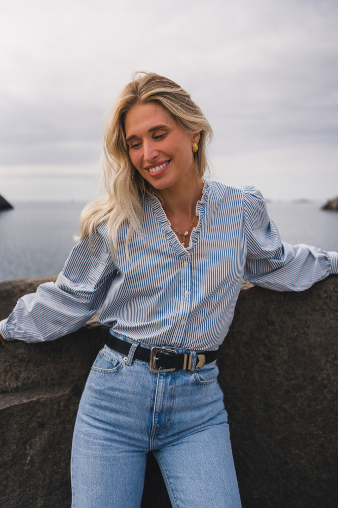 Skjorten har et klassisk og feminint uttrykk med smale blå striper og en flatterende V-hals med rysjekrage som gir et delikat preg. Den har lange ermer med mansjetter, knappelukking hele veien ned i front og en rett passform som gir et tidløst uttrykk. Laget i en lett og myk kvalitet som føles behagelig mot huden.