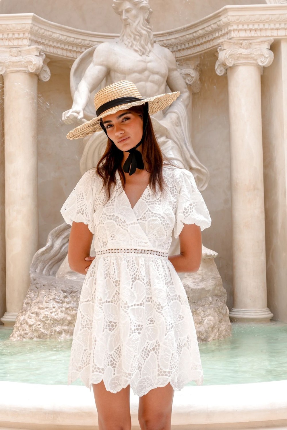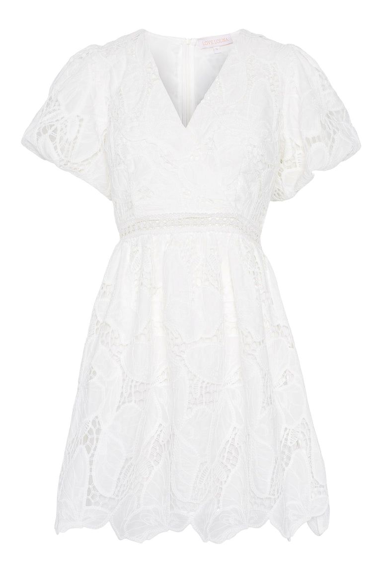 En romantisk hvit blondekjole med flatterende V-utringning og myke, flowy ermer. Kjolen har markert midje og et lett utsvingt skjørt som gir en feminin og elegant silhuett – perfekt til sommerlige feiringer, hagefester og spesielle anledninger.