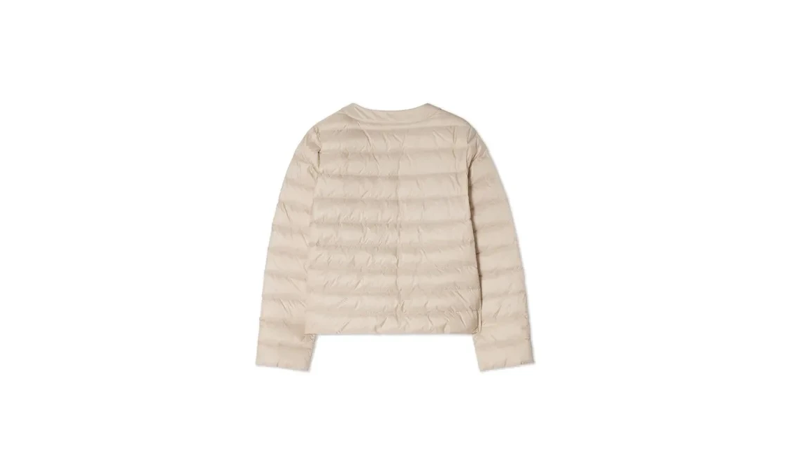 En lett polstret dunjakke med klassisk, rett silhuett. Jakken har rund hals og lukkes med elegante gullfargede trykknapper i front. Den matte, beige tonen gir et mykt og tidløst uttrykk, og gjør jakken enkel å style både til hverdag og pent. Perfekt som mellomlag eller alene på mildere dager.