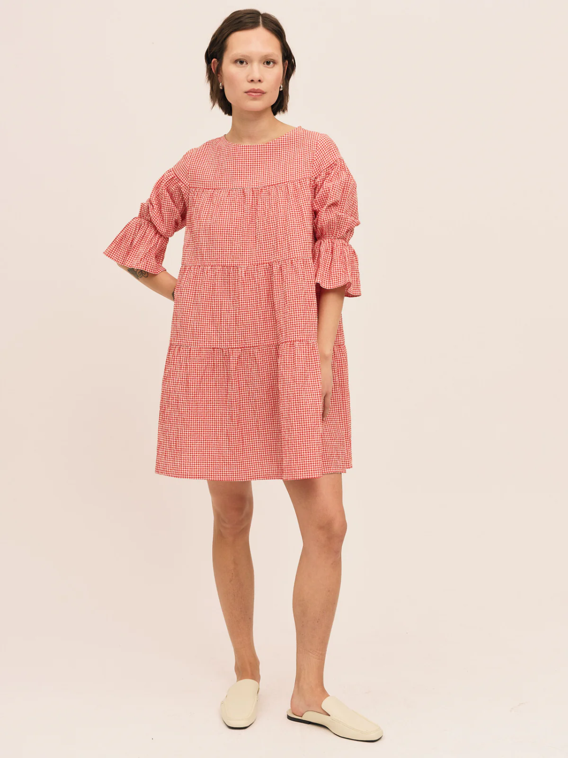 Indiana-kjolen er en flatterende minikjole med et oversized utseende og et rutete mønster. Kjolen har avrundet hals og brede trekvartlange ermer. Kjolen har også synlige utseende som løper rett over kjolen og ermene, noe som gir kjolen et utsvingt utseende og fasong. En perfekt hverdagskjole for sommeren.