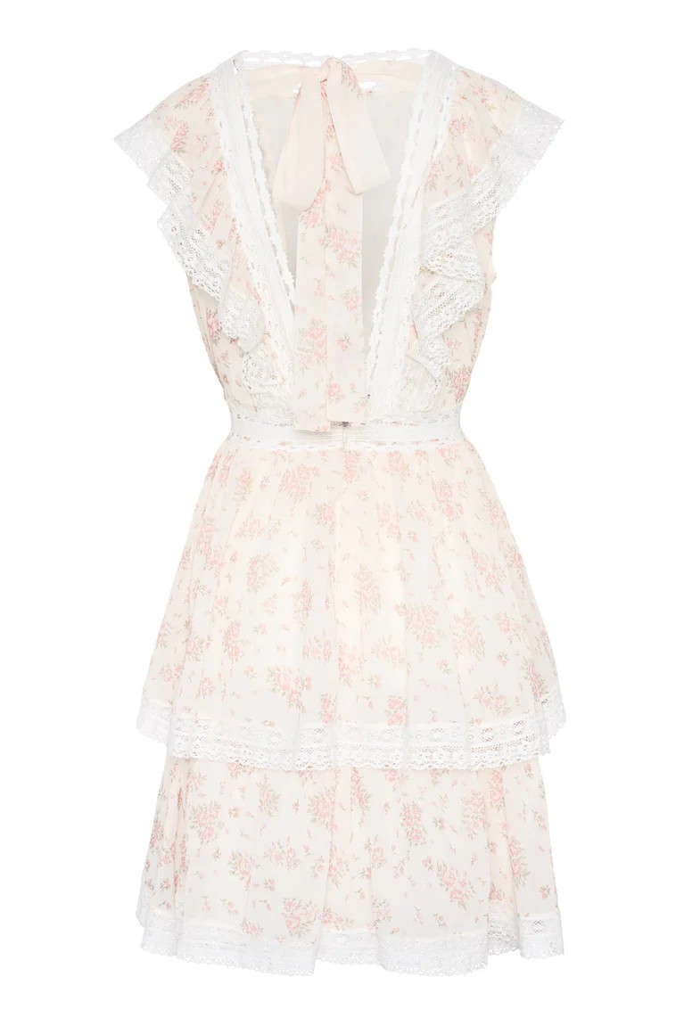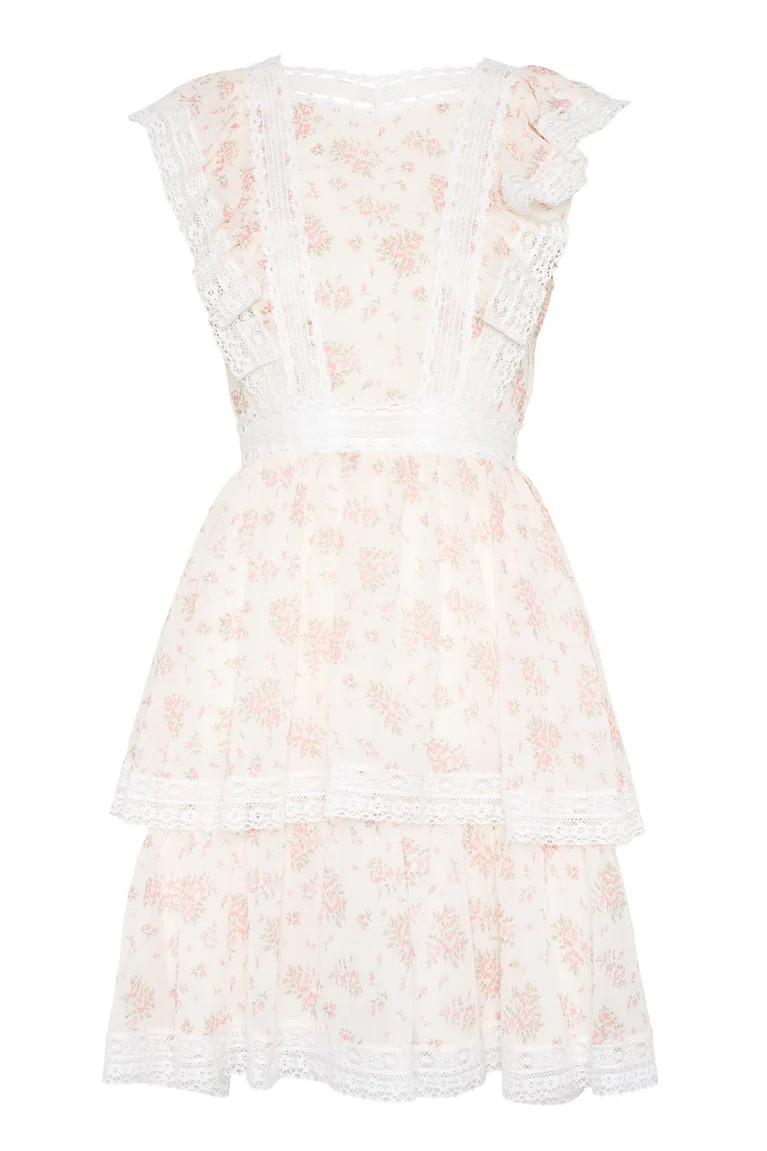 En romantisk minikjole med et delikat blomsterprint og feminine blondedetaljer. Designet med myke, voluminøse ermer, en markert midje og et lagdelt skjørt som gir en lett og flatterende silhuett. De intrikate blondedetaljene tilfører et vintage-inspirert uttrykk, som gjør kjolen perfekt til sommerdager, hagefester og spesielle anledninger.