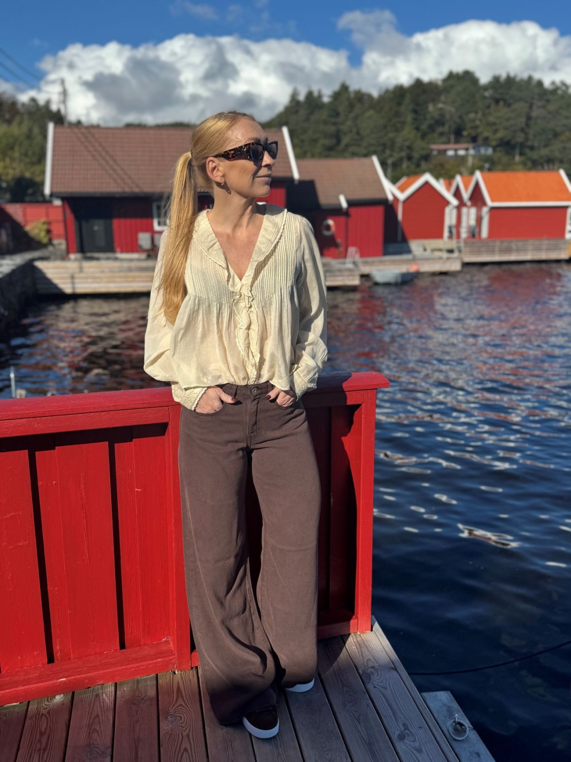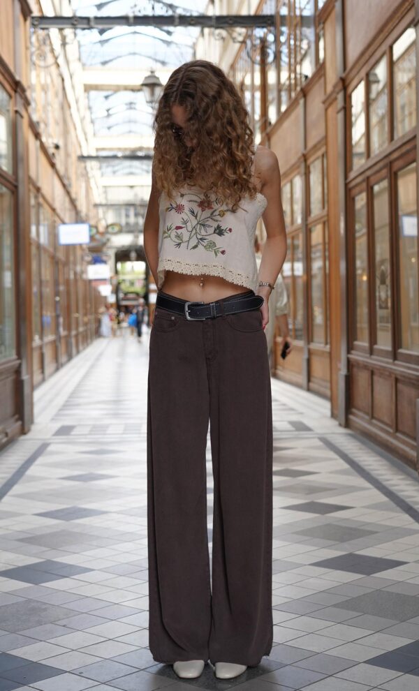 Kul og superbehagelig bukse med vide ben. 5 lommer, passe høyt liv.